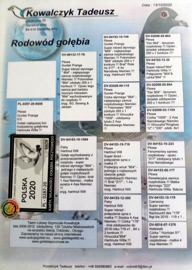 ***LIKWIDACJA HODOWLI*** Oryginalny gołąb z hodowli Tadeusza Kowalczyka. Szczegóły pochodzenia w rodowodzie. Więcej informacji pod nr. tel.: 730602025 *Odbiór osobisty lub po uzgodnieniu transportu likwidacja hodowli