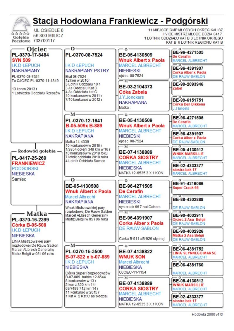 PL-013-25-5440 Podwójny wnuk Cracka 19 x wnuczka 9 Asa Holandii NL.21.737 w 2022r. Matka jest prawnuczką Goed Grijs 7x1 A. & B. Leideman