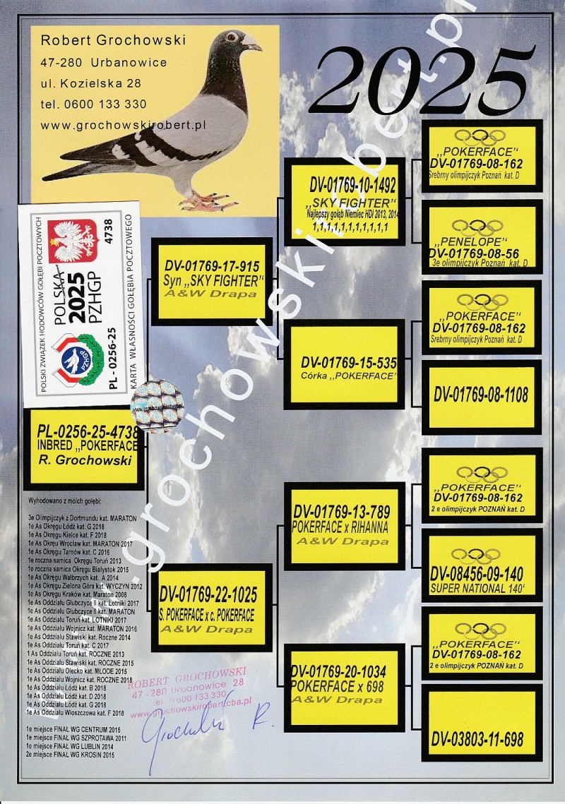 Oryginalny gołąb z hodowli Roberta Grochowskiego. Szczegóły pochodzenia w rodowodzie. Oferowany gołąb to prawdopodobnie SAMICA. Więcej informacji pod numerem 600133330 Przy opcji "KUP TERAZ" transport GRATIS (do najbliższego miasta od kupującego).