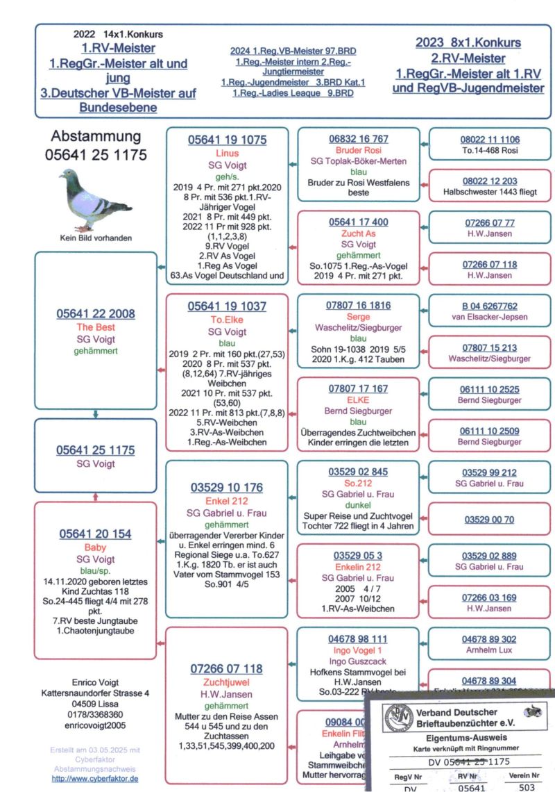 Szczegóły pochodzenia w rodowodzie. Pełne wyniki gołębia w sezonie lotowym na stronie: