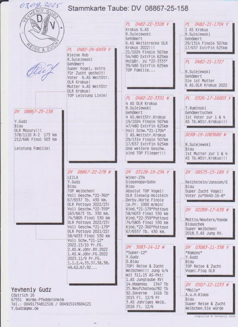 Gołąb DV-08867-25-158 - uczestnik 8 edycji OLR Mazury 2025. Ukończył cały program tegorocznej edycji. 212 miejsce z finału, 310 AS OLR Mazury.