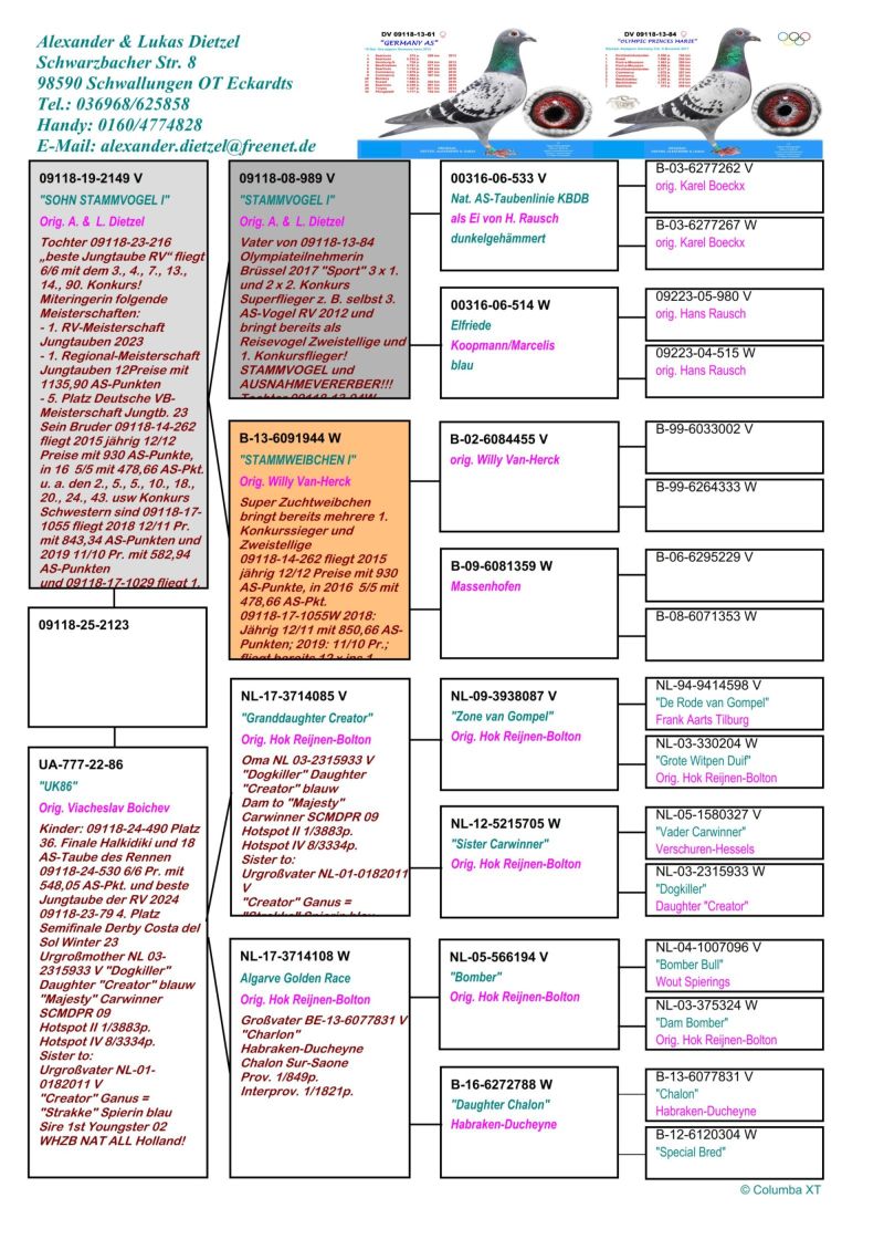 Szczegóły pochodzenia w rodowodzie. Pełne wyniki gołębia w sezonie lotowym na stronie: