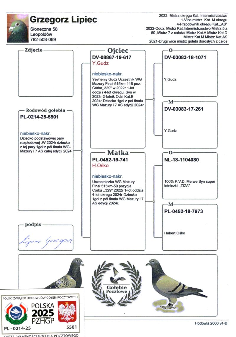 Szczegóły pochodzenia w rodowodzie. Pełne wyniki gołębia w sezonie lotowym na stronie: