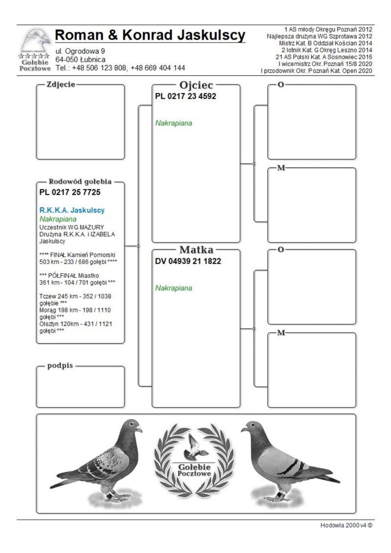 Szczegóły pochodzenia w rodowodzie. Pełne wyniki gołębia w sezonie lotowym na stronie:
