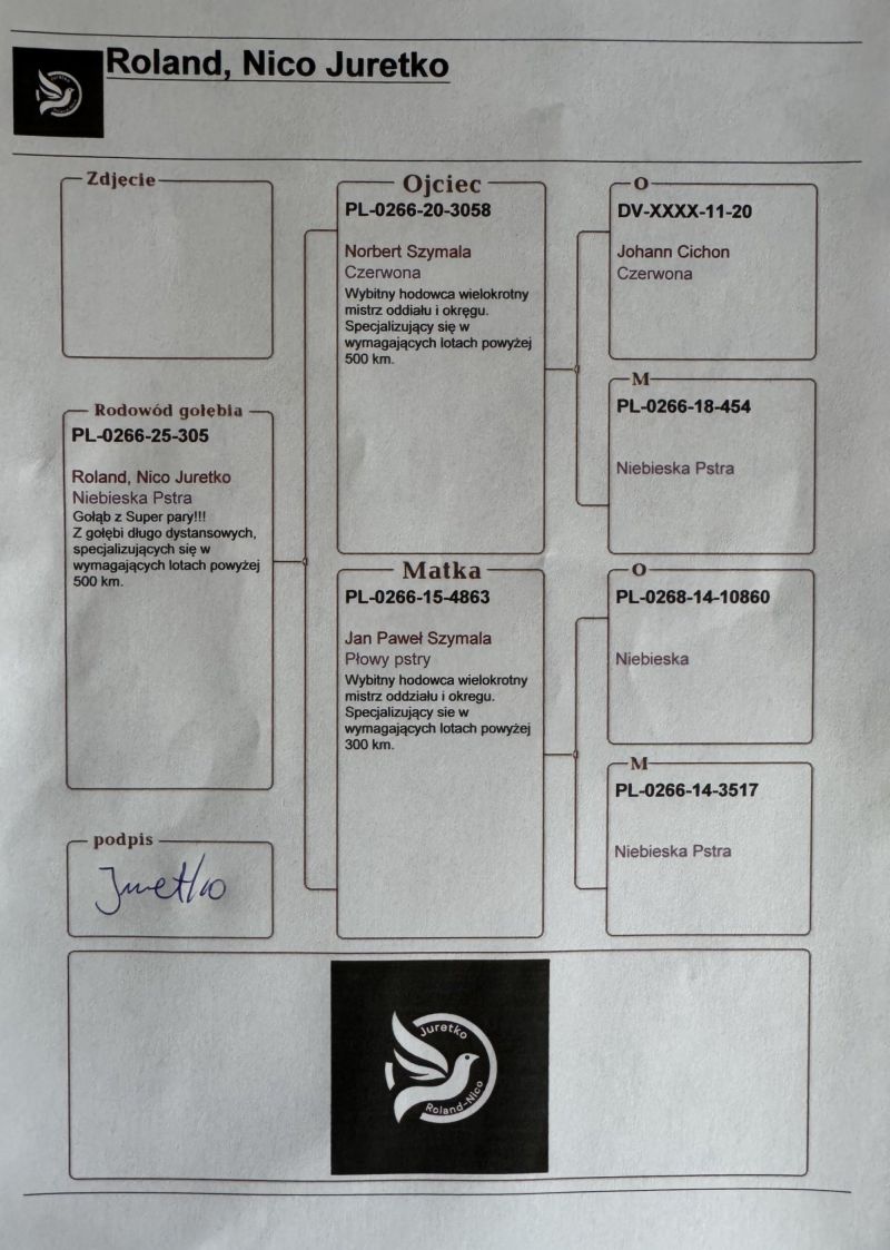 Szczegóły pochodzenia w rodowodzie. Pełne wyniki gołębia w sezonie lotowym na stronie: