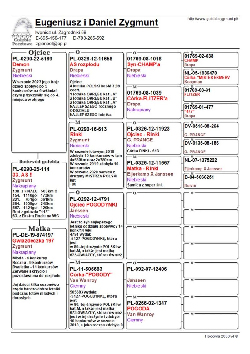 Szczegóły pochodzenia w rodowodzie. Pełne wyniki gołębia w sezonie lotowym na stronie: