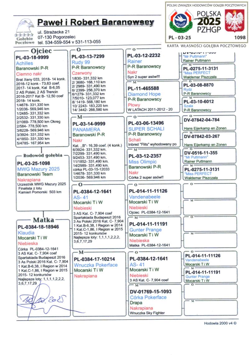 Gołąb PL-03-25-1098 - uczestnik 8 edycji OLR Mazury 2025. Ukończył cały program tegorocznej edycji. 248 miejsce z finału, 232 AS OLR Mazury.