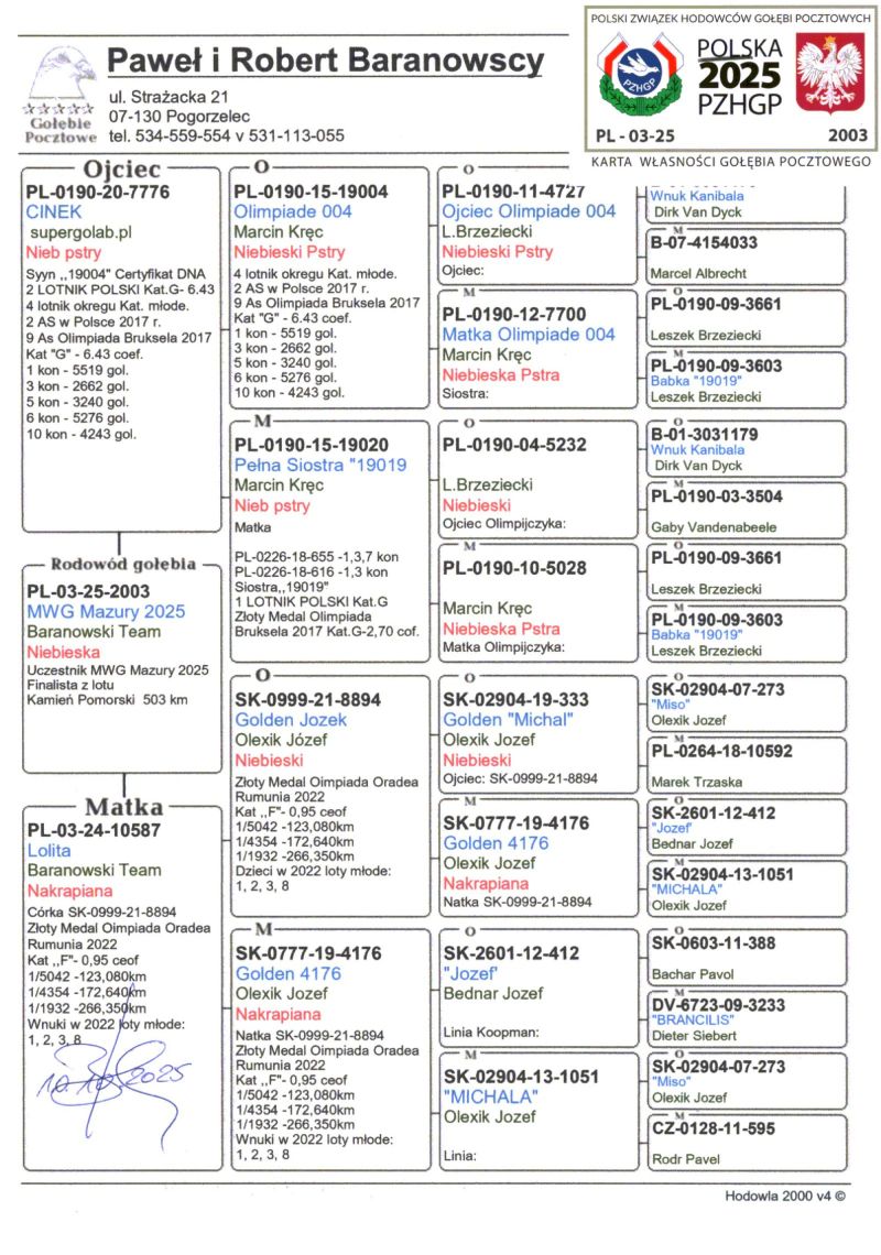 Gołąb PL-03-25-2003 - uczestnik 8 edycji OLR Mazury 2025. Ukończył cały program tegorocznej edycji. 177 miejsce z finału, 96 AS OLR Mazury.