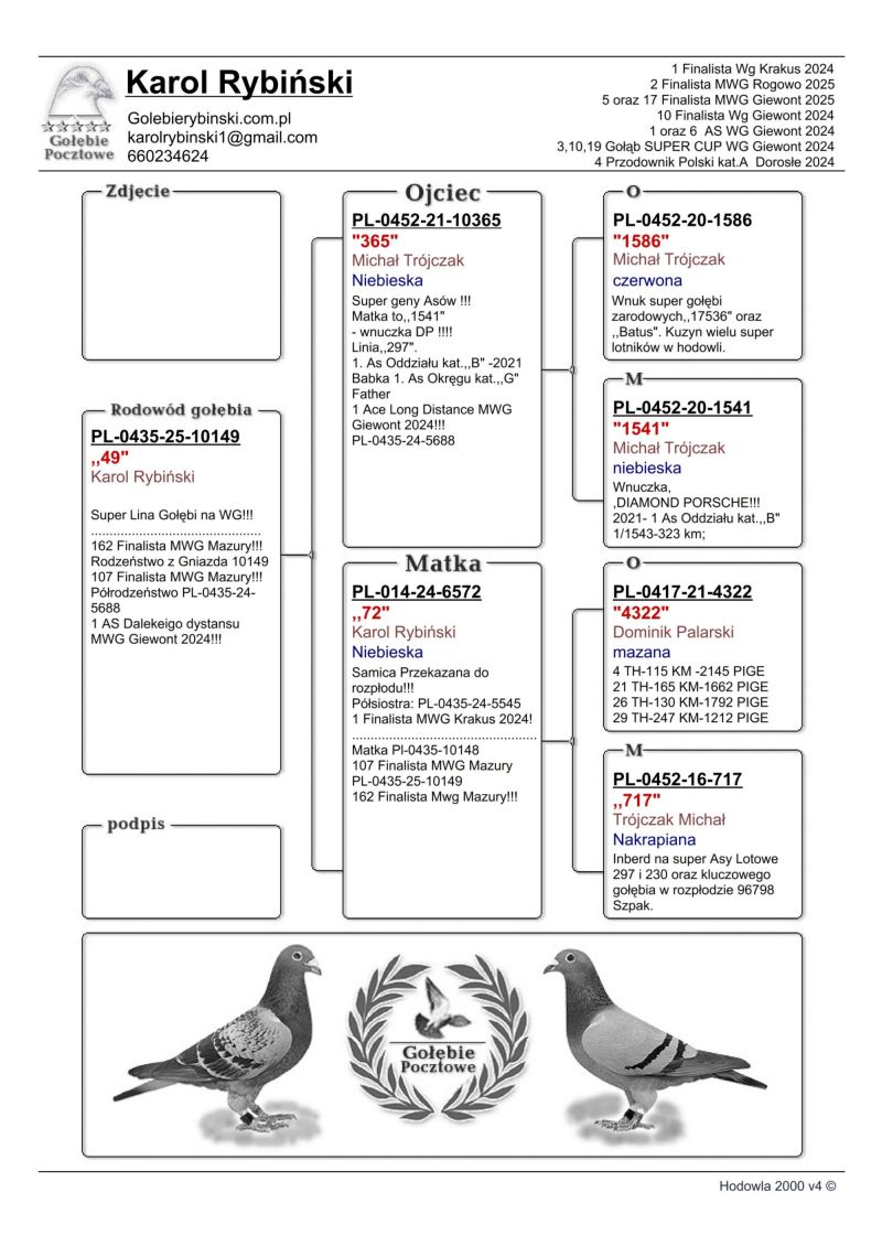 Szczegóły pochodzenia w rodowodzie. Pełne wyniki gołębia w sezonie lotowym na stronie: