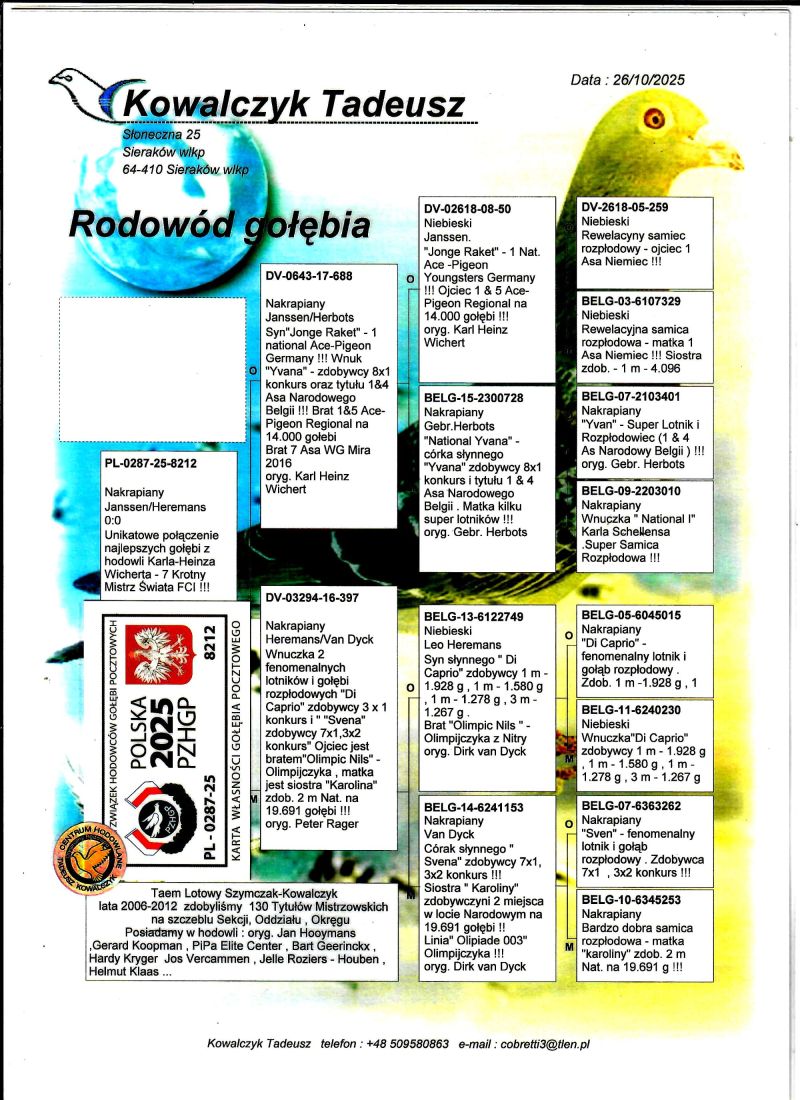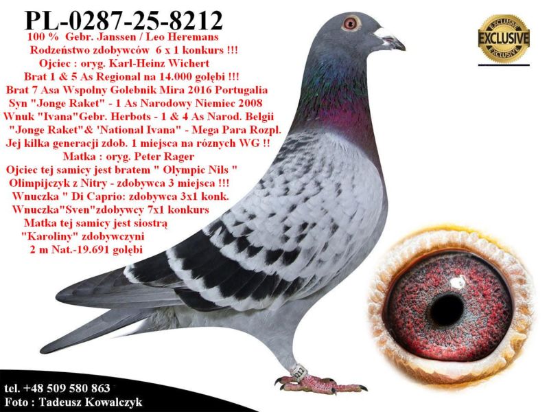 AUKCJA PROMOCYJNA ROCZNIKA 2025 (Cena obowiązuje wyłącznie na tej aukcji) Profesjonalna hodowla z wieloletnim doświadczeniem, posiadająca w swoim stadzie materiał najwyższej światowej klasy, wywodzący się od takich hodowców jak: Jan Hooymans, Gerard Koopman, Mike Ganus, Tjeerd & Jouke Elzinga, Gino Clicque, Jos Vercammen, Jelle Roziers, Bart Geerinckx, Batenburg – v/d Merwe, Altmiks – Pigeons, Jo & Florian Hendriks, Kornelis Winner Loft – linia „Romario”, W & F Ebben, Bert Braspenning, Dirk van den Bulck, Peter v/d Merwe, Jan van de Pasch, Van Elsacker-Jepsen, Roger Desmet – Matthijs, Arie Dijkstra, Leo Heremans, Pieter Veenstra, Gaby Vandenabeele, Karl-Heinz Wichert, Hardy Kruger, Helmut & Alfons Klaas, Gebr. Janssen. Najwyższej klasy materiał hodowlany – najlepsze linie danych Hodowców. Wszystkie wylicytowane gołębie będą dostarczane firmą kurierską.