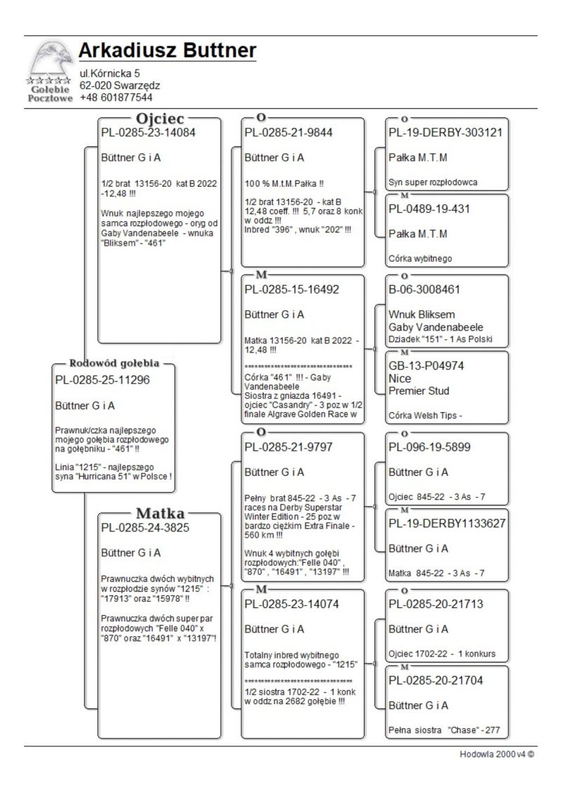 Piękny samczyk, teraz już zewnętrznie całkowicie wypierzony - prawnuk oraz pokrewieństwo na mojego najlepszego gołębia rozpłodowego -oryg od Gaby Vandenabeele - wnuka "Bliksem" - "461".Linia "1215" - najlepszego syna Hurricana 51 w Polsce, Linia "Felle 040" oraz "870" a także "202" i "396" M.T.M Pałka ! "17913" (syn 1215)- najlepszy mój samiec rozpłodowy jeżeli chodzi o WG i nie tylko samiczka 6334-14 najlepiej punktowała mi do GMP 2017 kiedy udało się zdobyć XII miejsce w Polsce. Samiczka jest też właśnie wnuczką 1215 , z którego wywodzą się z ....8,25(dla Kol.Chłopeckiego) , 35 , 130 ,231 , 263 , 277 , 278 gołąb w finale SAMDPR w RPA wywodził się z 1215 ...szczególnie ta czołówka wydaje mi się , że jest imponująca ...nie wiele jest takich linii , które potrafią takie coś zrobić... po bracie 17913 - 15978 był też w 2020 roku 5 gołąb w finale WG Krakus . "2644" (podwójna wnuczka "17913") - babka 2 super samic Lotowych u Kol Kazimierza Goździejewskiego ( jedna w kat M w 2023 roku miała coeff 4,84 a druga w 2024 roku 2,58 - 2 x 1 na oddział - w kat "I" - coeff 9 z haczykiem) "Felle 040" ojciec m.in 8755 , który dla Kol . Krzyśka Kusia wylatał 4 wynik w Polsce w kat olimpijskie E i był gołębiem rezerwowym na olimpiadę. Jest też pradziadkiem PL-0122-22-2219 - w 2 sezony na 21 wkładań 20 konkursów - kat A coeff 9,08 a z dwóch lat do wystaw kat A-74,86 , kat B-65,94 a kat D-72,20 W 2023 roku zdobył 1 konk na ok 4100 gołębi z miejsc Sulechów a w 2024 roku 2 x 2 konk w oddz !!! oraz PL-0122-22-5510 w kat A w 2024 roku uzyskał coeff. 4,75 Zdobył też 1 konk na oddz z miejsc. Brzeg Dolny na 4322 gołębie !! Został też 4 Asem Polski kat krótki dystans 2024 z coeff 17 z groszem z 5 lotów do kat A właśnie oraz także pradziadkiem PL-0122-21-2246 - na 16 wkładań 16 konkursów i w 2024 roku uzyskał kat A - 10,32 coeff , kat B - 8,64 coeff a z dwóch lat do wystaw kat A 53 coeff i został na ostatniej wystawie TYTUŁ 17 ASA POLSKI , w kat olimp B - 67,76 coeff a w kat D - 53,20 coeff a w 2024 roku w kat średni dystans został w/g konkursu redakcji ZOSTAŁ 9 ASEM A TAKŻE WYGRAŁ Z LOTU OKRĘGOWEGO NA 8137 GOŁĘBI Z LOTU ŚWINOUJŚCIE + 500 KM i pradziadkiem PL-0122-22-5118 uzyskał w tym 2024 roku coeff 5,24 w kat A oraz w 2023 roku 2 konk na oddział z lotu Bieganów na ok 3000 gołębi oraz 2 konkurs na oddział w 2024 rokuz miejscowości Kościan na około 4300 gołębi dla Kolegi Jacka Orszulika !!!"Felle" jest też ojcem dziadkiem wielu innych super gołębi lotowych - asów na szczeblu sekcji , oddziału i okręgu oraz gołębi ropzłodowych ! "870" - matka 14196 - 2 as oddz kat A , 8701 - ojciec 2 x 10 gołąb z finału WG Kuźnica 2015 i 2016 , i wielu wielu innych innych.Babka 1 gołębia z finału WG Podhale 2024 dla Kol. Bogdana Bieli. Babka super samca rozpłodowego u Kol Jacka Orszulika, matka "17915" - "17915" - wybitna samica rozpłodowa - babka dwóch mega lotników na PLGP u Kol Krzysztofa Mrowieca oraz babka 2 super samic Lotowych u Kol Kazimierza Goździejewskiego ( jedna w kat M w 2023 roku miała coeff 4,84 a druga w 2024 roku 2,58 - 2 x 1 na oddział - w kat "I" - coeff 9 z haczykiem) "461" najważniejsze referencje z 2024 roku: 1 As Rejonu z 8 lotów rejonowych - prawnuczka 461 u Kol Adama Gasperowicza, prawnuk "461" wygrał finał na WG Podhale wygrywając 50 000 dla Kolegi Bogdana Bieli !- liczba jedynek jego wnuków , prawnuków i oczywiście dzieci będzie około stu a kilkadziesiąt gołębi z 461 zajmowało top 10 w kat As w różnych kategoriach w różnych okręgach w Polsce- tylko w 2022 roku w 9 różnych oddziałach przeważnie prawnuki zdobywały 1 lokatę w oddz !!! Jego wnuczka została też na olimpiadzie w tym roku 4 gołębiem świata w kat H dla Kol Łukasza Reguły. !! Na screenie przykład jak potrafią siadać gołębie w oddz z linii 461 ... 3-prawnuk,4 -wnuk , 5-wnuk , 6 - roczna wnuczka - kat A 9 z groszem ma , 7 wnuk , 11 - wnuk oraz 15 - wnuk 461. oraz kolejny lot z 2020 roku : 1,2,3,5,7,8 wnuk oraz 15 prawnuk ? do tego roczna samiczka Kolegów Piotra I Marcina Żureckich z Kępna została 6 asem Polski w kat G ...tak leciała... 2 na 5200 g ze 174 km 8 na 4573 z 219 km 8 na 3583 g z 324 km 8 na 1764 g z 324 g 21 na 4535 g z 549 km - rej - coeff jak widać na zdjęciu 13,54 miała też szósty super lot była 25 na 4984 g coeff 5,02 1 goląb z Extra finału na WG Giewont 2022 dla Teamu Chudy-Molek to też linia "461" ojciec to syn mojej super wdowy 2161-12 ,, Dwie Prawnuczki .... u Kol Kazimierza Goździejewskiego ( jedna w kat M w 2023 roku miała coeff 4,84 ( 1 as okręgu Wałbrzych a druga w 2024 roku 2,58 - 2 x 1 na oddział (2 as Polski kat M w/g miesięcznika "Hodowca") - w kat "I" - coeff 9 z haczykiem), "461" to też pradziadek PL-0122-22-2219 - w 2 sezony na 21 wkładań 20 konkursów - kat A coeff 9,08 a z dwóch lat do wystaw kat A-74,86 , kat B-65,94 a kat D-72,20 W 2023 roku zdobył 1 konk na ok 4100 gołębi z miejsc Sulechów a w 2024 roku 2 x 2 konk w oddz !!! oraz pradziadek PL-0122-22-5510 w kat A w 2024 roku uzyskał coeff. 4,75 Zdobył też 1 konk na oddz z miejsc. Brzeg Dolny na 4322 gołębie !! Został też 4 Asem Polski kat krótki dystans 2024 z coeff 17 z groszem z 5 lotów do kat A właśnie dla Kolegi Jacka Orszulika !!! oraz wiele,wiele innych.....od 2017 roku 30x mistrzostwo oddz w różnych kategoriach w tym 2019-2021 3 x z rzędu supermistrzostwo oddziału Poznań, więcej info 601 877 544
