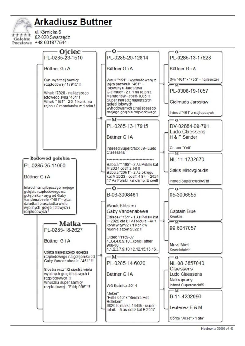 Super młody, inbred na mojego najlepszego gołębia rozpłodowego w historii - oryg od Gaby Vandenabeele - wnuka Bliksem - "461" ! Wnuk/czka super samicy "17915", prawnuk/czka najlepszego syna 461 - 17828, prawnuk/czka 870, 791 i Felle 040 !! "791" - ojciec "ZigZag McQueen" - 117 poz w finale SAMDPR , ojciec "Lotniskowej" , najlepszej samicy rozpłodowej u Kol Krzyśka Kusia oraz dziadek 8755 - rezerwa na olimpiadę w kat olimpijskiej maraton . Jest też pradziadkiem PL-0122-22-2219 - w 2 sezony na 21 wkładań 20 konkursów - kat A coeff 9,08 a z dwóch lat do wystaw kat A-74,86 , kat B-65,94 a kat D-72,20 W 2023 roku zdobył 1 konk na ok 4100 gołębi z miejsc Sulechów a w 2024 roku 2 x 2 konk w oddz !!! oraz PL-0122-22-5510 w kat A w 2024 roku uzyskał coeff. 4,75 Zdobył też 1 konk na oddz z miejsc. Brzeg Dolny na 4322 gołębie !! Został też 4 Asem Polski kat krótki dystans 2024 z coeff 17 z groszem z 5 lotów do kat A właśnie dla Kolegi Jacka Orszulika !!!oraz ojciec , dziadek i pradziadek wielu wybitnych gołębi rozpłodowych i lotowych na wielu gołębnikach !!"Felle 040" ojciec m.in 8755 , który dla Kol . Krzyśka Kusia wylatał 4 wynik w Polsce w kat olimpijskie E i był gołębiem rezerwowym na olimpiadę. Jest też pradziadkiem PL-0122-22-2219 - w 2 sezony na 21 wkładań 20 konkursów - kat A coeff 9,08 a z dwóch lat do wystaw kat A-74,86 , kat B-65,94 a kat D-72,20 W 2023 roku zdobył 1 konk na ok 4100 gołębi z miejsc Sulechów a w 2024 roku 2 x 2 konk w oddz !!! oraz PL-0122-22-5510 w kat A w 2024 roku uzyskał coeff. 4,75 Zdobył też 1 konk na oddz z miejsc. Brzeg Dolny na 4322 gołębie !! Został też 4 Asem Polski kat krótki dystans 2024 z coeff 17 z groszem z 5 lotów do kat A właśnie oraz także pradziadkiem PL-0122-21-2246 - na 16 wkładań 16 konkursów i w 2024 roku uzyskał kat A - 10,32 coeff , kat B - 8,64 coeff a z dwóch lat do wystaw kat A 53 coeff i został na ostatniej wystawie TYTUŁ 17 ASA POLSKI , w kat olimp B - 67,76 coeff a w kat D - 53,20 coeff a w 2024 roku w kat średni dystans został w/g konkursu redakcji ZOSTAŁ 9 ASEM A TAKŻE WYGRAŁ Z LOTU OKRĘGOWEGO NA 8137 GOŁĘBI Z LOTU ŚWINOUJŚCIE + 500 KM i pradziadkiem PL-0122-22-5118 uzyskał w tym 2024 roku coeff 5,24 w kat A oraz w 2023 roku 2 konk na oddział z lotu Bieganów na ok 3000 gołębi oraz 2 konkurs na oddział w 2024 rokuz miejscowości Kościan na około 4300 gołębi dla Kolegi Jacka Orszulika !!!"Felle" jest też ojcem dziadkiem wielu innych super gołębi lotowych - asów na szczeblu sekcji , oddziału i okręgu oraz gołębi ropzłodowych ! "870" - matka 14196 - 2 as oddz kat A , 8701 - ojciec 2 x 10 gołąb z finału WG Kuźnica 2015 i 2016 , i wielu wielu innych innych.Babka 1 gołębia z finału WG Podhale 2024 dla Kol. Bogdana Bieli. Babka super samca rozpłodowego u Kol Jacka Orszulika, matka "17915" - "17915" - wybitna samica rozpłodowa - babka dwóch mega lotników na PLGP u Kol Krzysztofa Mrowieca oraz babka 2 super samic Lotowych u Kol Kazimierza Goździejewskiego ( jedna w kat M w 2023 roku miała coeff 4,84 a druga w 2024 roku 2,58 - 2 x 1 na oddział - w kat "I" - coeff 9 z haczykiem) "461" najważniejsze referencje z 2024 roku: 1 As Rejonu z 8 lotów rejonowych - prawnuczka 461 u Kol Adama Gasperowicza, prawnuk "461" wygrał finał na WG Podhale wygrywając 50 000 dla Kolegi Bogdana Bieli !- liczba jedynek jego wnuków , prawnuków i oczywiście dzieci będzie około stu a kilkadziesiąt gołębi z 461 zajmowało top 10 w kat As w różnych kategoriach w różnych okręgach w Polsce- tylko w 2022 roku w 9 różnych oddziałach przeważnie prawnuki zdobywały 1 lokatę w oddz !!! Jego wnuczka została też na olimpiadzie w tym roku 4 gołębiem świata w kat H dla Kol Łukasza Reguły. !! Na screenie przykład jak potrafią siadać gołębie w oddz z linii 461 ... 3-prawnuk,4 -wnuk , 5-wnuk , 6 - roczna wnuczka - kat A 9 z groszem ma , 7 wnuk , 11 - wnuk oraz 15 - wnuk 461. oraz kolejny lot z 2020 roku : 1,2,3,5,7,8 wnuk oraz 15 prawnuk ? do tego roczna samiczka Kolegów Piotra I Marcina Żureckich z Kępna została 6 asem Polski w kat G ...tak leciała... 2 na 5200 g ze 174 km 8 na 4573 z 219 km 8 na 3583 g z 324 km 8 na 1764 g z 324 g 21 na 4535 g z 549 km - rej - coeff jak widać na zdjęciu 13,54 miała też szósty super lot była 25 na 4984 g coeff 5,02 1 goląb z Extra finału na WG Giewont 2022 dla Teamu Chudy-Molek to też linia "461" ojciec to syn mojej super wdowy 2161-12 ,, Dwie Prawnuczki .... u Kol Kazimierza Goździejewskiego ( jedna w kat M w 2023 roku miała coeff 4,84 ( 1 as okręgu Wałbrzych a druga w 2024 roku 2,58 - 2 x 1 na oddział (2 as Polski kat M w/g miesięcznika "Hodowca") - w kat "I" - coeff 9 z haczykiem), "461" to też pradziadek PL-0122-22-2219 - w 2 sezony na 21 wkładań 20 konkursów - kat A coeff 9,08 a z dwóch lat do wystaw kat A-74,86 , kat B-65,94 a kat D-72,20 W 2023 roku zdobył 1 konk na ok 4100 gołębi z miejsc Sulechów a w 2024 roku 2 x 2 konk w oddz !!! oraz pradziadek PL-0122-22-5510 w kat A w 2024 roku uzyskał coeff. 4,75 Zdobył też 1 konk na oddz z miejsc. Brzeg Dolny na 4322 gołębie !! Został też 4 Asem Polski kat krótki dystans 2024 z coeff 17 z groszem z 5 lotów do kat A właśnie dla Kolegi Jacka Orszulika !!! oraz wiele,wiele innych.....od 2017 roku 30x mistrzostwo oddz w różnych kategoriach w tym 2019-2021 3 x z rzędu supermistrzostwo oddziału Poznań, więcej info 601 877 544