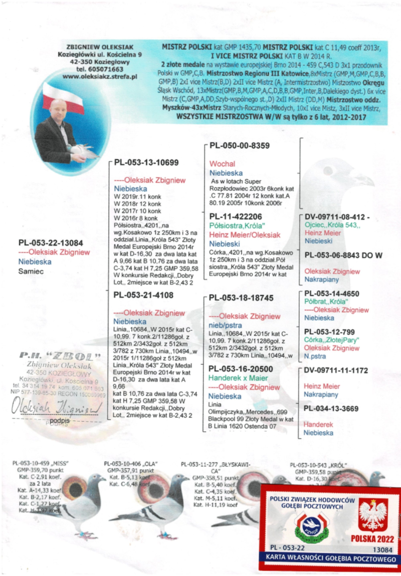 Oryginalny gołąb z hodowli Zbigniewa Oleksiaka. Więcej informacji pod numerem telefonu 731 949 100. Możliwość wysyłki na warunkach kurierów świadczących usługi przewozu gołębi po wcześniejszym ustaleniu szczegółów (koszt około 150 zł za paczkę do 4 szt.) oraz odbiór osobisty woj. śląskie. Po kliknięciu w LINK ukaże się filmik z prezentacją gołębia.