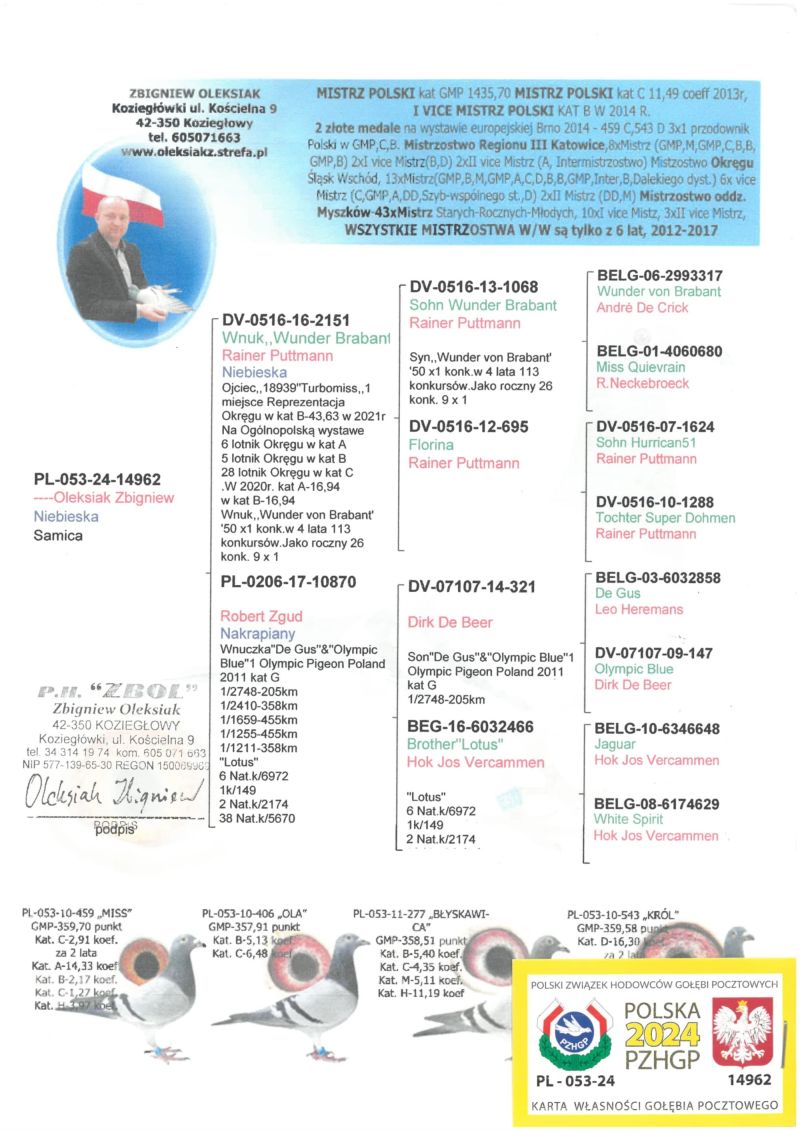 PL-053-24-14962 - oryg. Zbigniew Oleksiak - pół-brat 6 lotnika Polski w kat. B (linia Hurican51, Super Dohmen, Wunder von Brabant, Olympic Blue, Vercammen)
