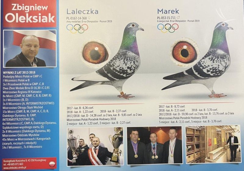 Oryginalny gołąb z hodowli Zbigniewa Oleksiaka. Więcej informacji pod numerem telefonu 731 949 100. Możliwość wysyłki na warunkach kurierów świadczących usługi przewozu gołębi po wcześniejszym ustaleniu szczegółów (koszt około 150 zł za paczkę do 4 szt.) oraz odbiór osobisty woj. śląskie. Po kliknięciu w LINK ukaże się filmik z prezentacją gołębia. Gołąb zakupiony jako samica, okazał się samcem.