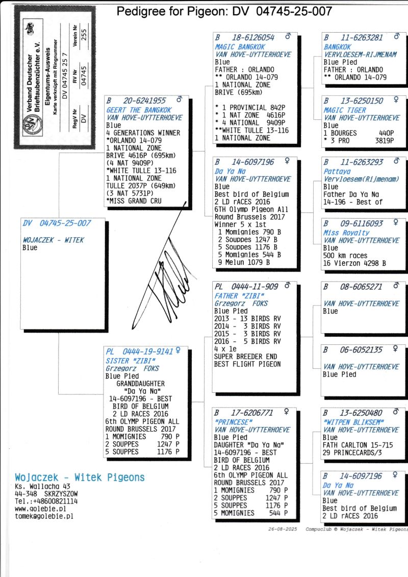 Płeć gołębia to prawdopodobnie samczyk. Szczegóły pochodzenia w rodowodzie. Więcej informacji pod nr tel.: +48 600 821 114.