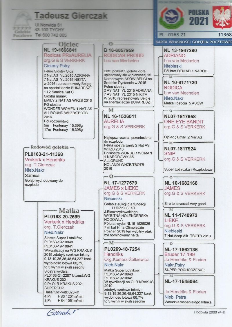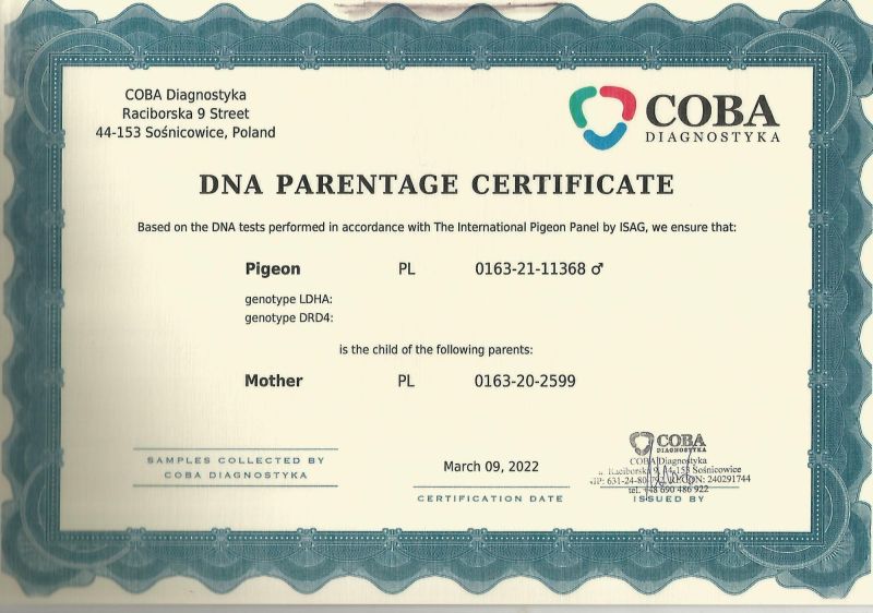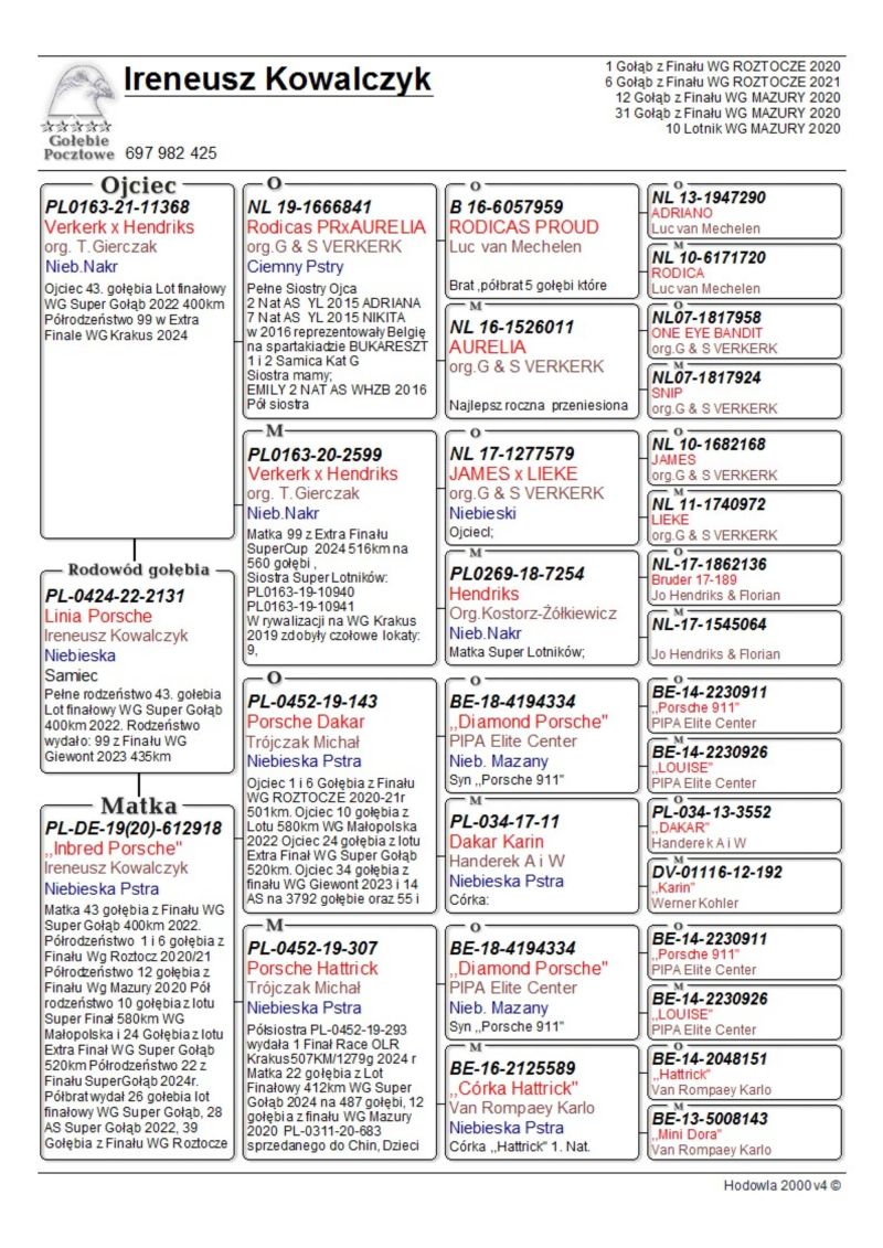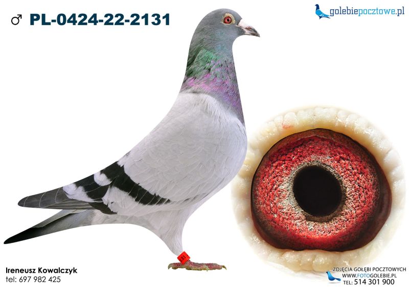 Gołąb z hodowli Ireneusz Kowalczyk. Informację o gołębiu dostępne w rodowodzie. Więcej informacji pod numerem telefonu: 697-982-425. Wysyłka po stronie kupującego