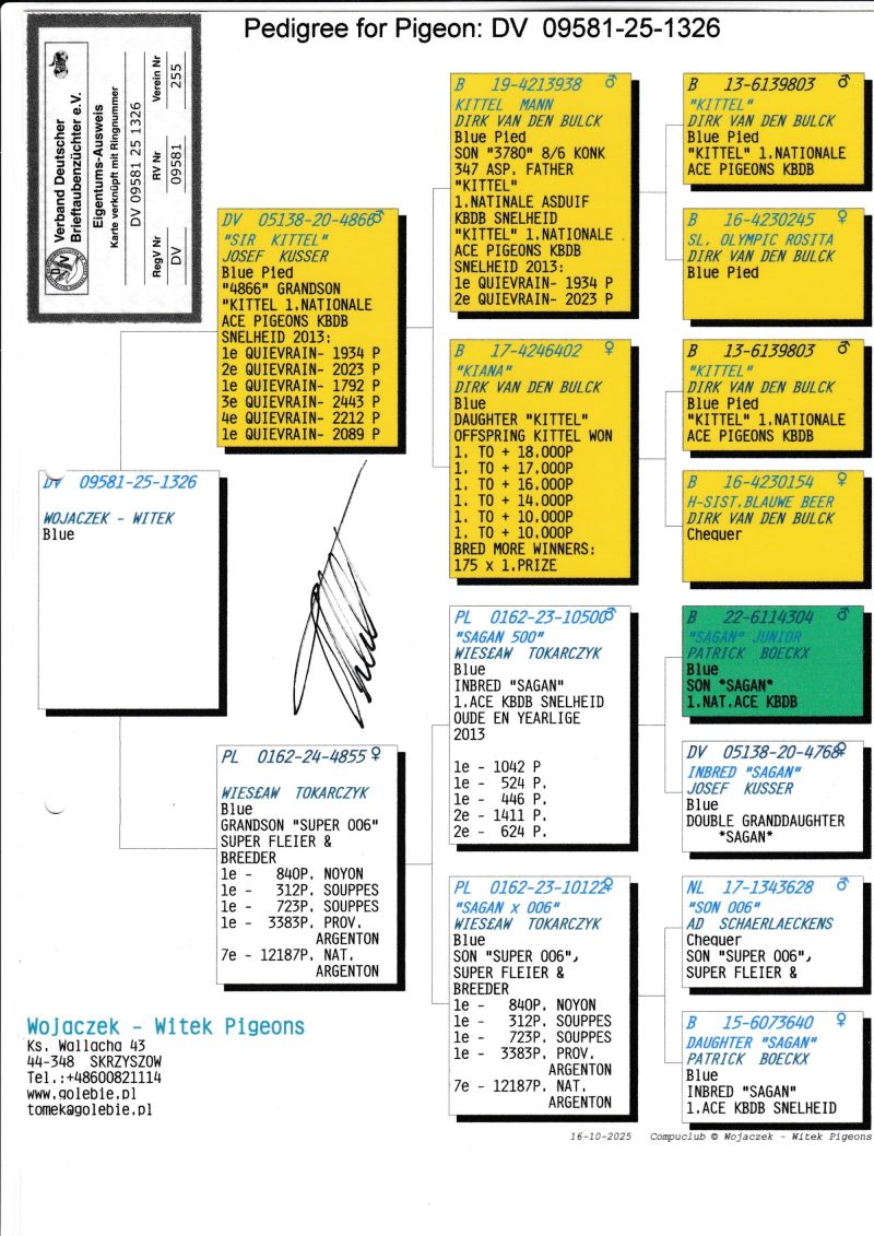 Ojciec prezentowanego gołębia jest podwójnym wnukiem "Kittel" Dirk van den Bulck od Josefs Kussera a matka to wnuczka "Sagan" Patrick Boeckx od Wiesława Tokarczyka. Szczegóły pochodzenia w rodowodzie. Więcej informacji pod nr tel.: +48 600 821 114. KOSZT TRANSPORTU 100 ZŁ (maksymalnie 3 gołębie w jednej paczce). KOSZTA TRANSPORTU KLIENCI BĘDĄ PŁACIĆ BEZPOŚREDNIO KIEROWCY KTÓRY PRZYWIEZIE GOŁĘBIE. TRANSPORT ODBĘDZIE SIĘ MIĘDZY 20.11.2025 a 10.12.2025