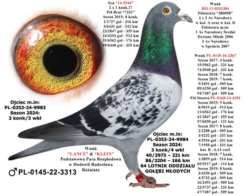PL-013-25-5440 Podwójny wnuk Cracka 19 x wnuczka 9 Asa Holandii NL.21.737 w 2022r. Matka jest prawnuczką Goed Grijs 7x1 A. & B. Leideman