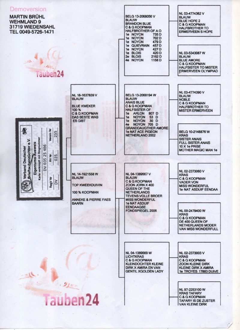 Opis: UWAGA!!! GOŁĘBIE DOSTARCZANE TYLKO PO WCZEŚNIEJSZEJ WPŁACIE NA KONTO BANKOWE!!! KOSZT TRANSPORTU 100 ZŁ (maksymalnie 3 gołębie w jednej paczce). KOSZTA TRANSPORTU KLIENCI BĘDĄ PŁACIĆ BEZPOŚREDNIO KIEROWCY KTÓRY PRZYWIEZIE GOŁĘBIE. TRANSPORT ODBĘDZIE SIĘ MIĘDZY 20-30.11.2025. Gołąb z WG OSTWESTFALEN DERBY - Edycja 2025. W sezonie 2025 przyjęto 952 gołębie z czego 380 poszło na finał. Gołębie po całym programie lotowym. LOT 1 - 113 km/prędkość około 1340 m/min. LOT 2 - 150 km/prędkość około 1400 m/min. LOT 3 - 232 km/prędkość około 1050 m/min. PÓŁFINAŁ - 250 km/prędkość około 1000 m/min. FINAŁ - 428 km/prędkość około 1350 m/min. Osiągnięcia gołębi wypisane na zdjęciu. Szczegóły pochodzenia w rodowodzie. Kontakt w sprawie transportu pod numerem telefonu 722-250-182. Więcej informacji pod numerem tel. +49 176-998-863-03 (Hodowca mówi po polsku).