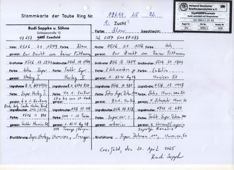 Płeć: młody gołąb Hodowca - rasa: WG Ostwestfalen Derby 2025 Zakończenie: 15.11.2025 godz. 19:04