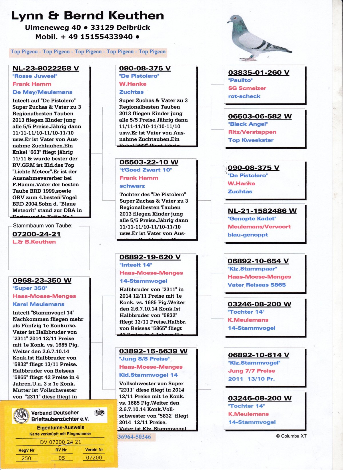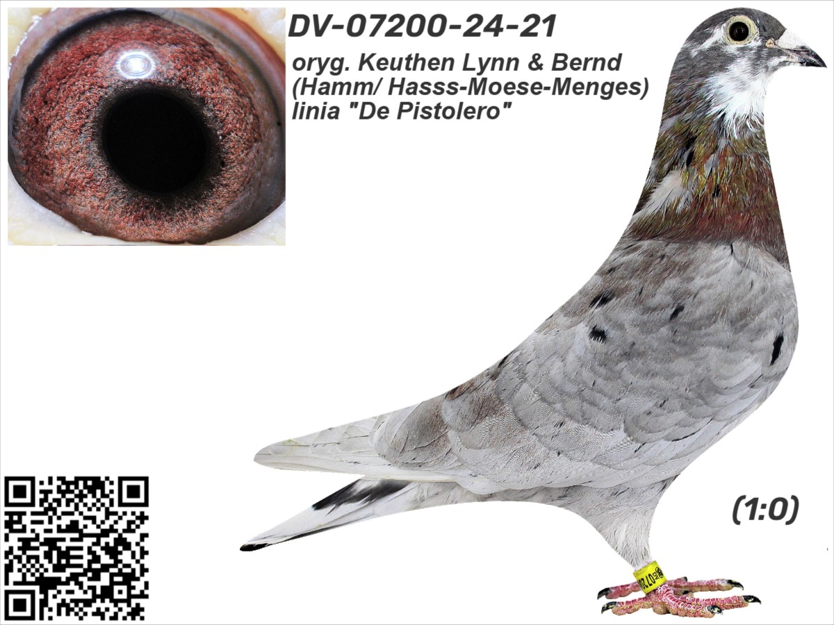 oryg. Keuthen Lynn & Bernd (Hamm/ Hasss-Moese-Menges), linia "De Pistolero" Szczegóły pochodzenia w rodowodzie. Gołąb jest sprzedawany bezpośrednio od hodowcy i znajduje się już w Polsce, można go obejrzeć w miejscowości Zblewo (woj. pomorskie), po wcześniejszym kontakcie telefonicznym. Sprzedający może zorganizować transport gołębia w cenie ok. 150 - 200 PLN w zależności od ilości gołębi lub można go odebrać osobiście. Więcej informacji o gołębiu i transporcie pod nr tel.: 511 607 710.