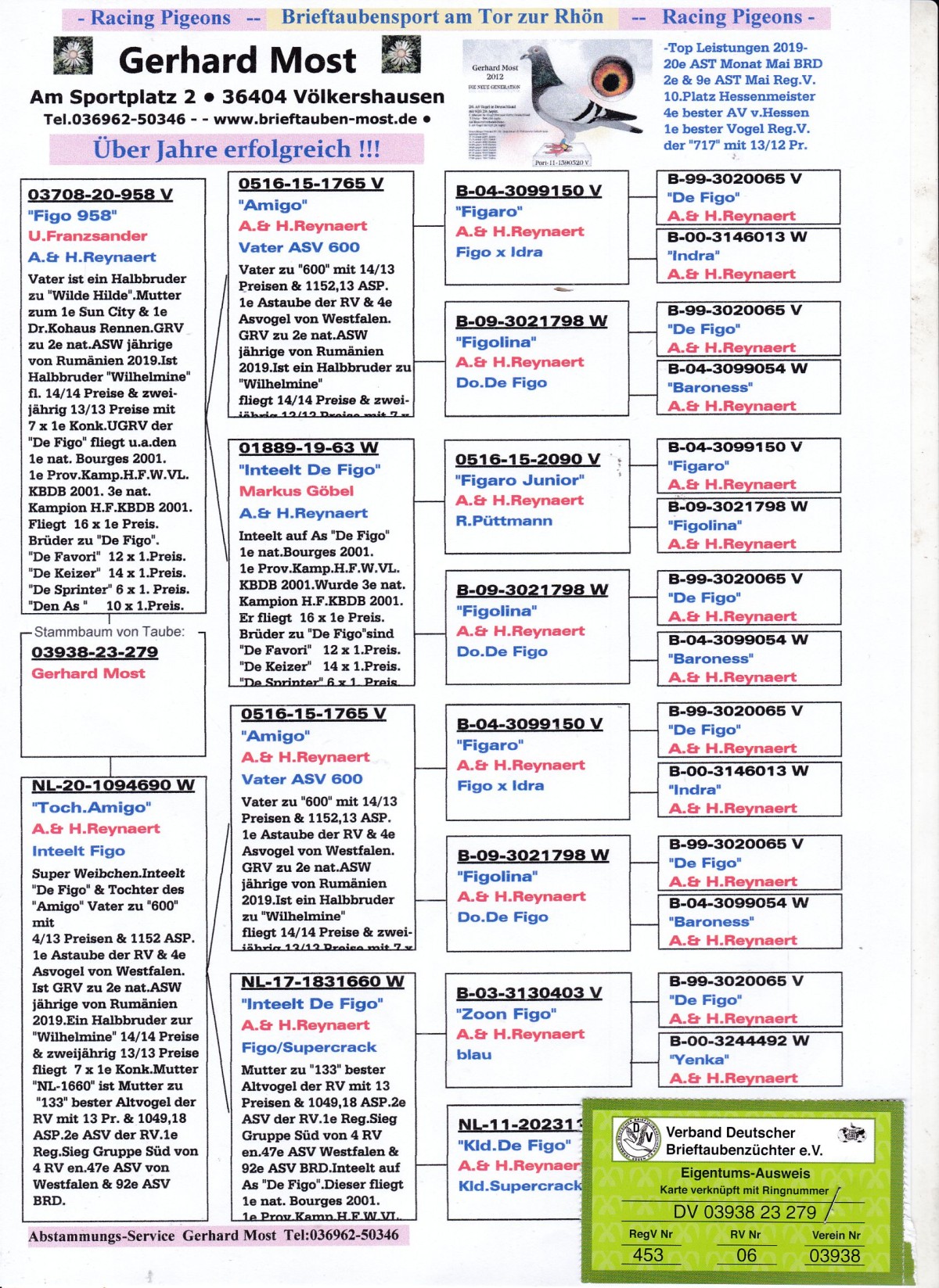 oryg. Gerhard Most (Reynaert/ Gobel), linia "De Figo", "Amigo", "Figaro" Szczegóły pochodzenia w rodowodzie. UWAGA!!! - płeć gołębia określona jest prawdopodobnie. Gołąb jest sprzedawany bezpośrednio od hodowcy i znajduje się już w Polsce, można go obejrzeć w miejscowości Zblewo (woj. pomorskie), po wcześniejszym kontakcie telefonicznym. Sprzedający może zorganizować transport gołębia w cenie ok. 150 - 200 PLN w zależności od ilości gołębi lub można go odebrać osobiście. Więcej informacji o gołębiu i transporcie pod nr tel.: 511 607 710.