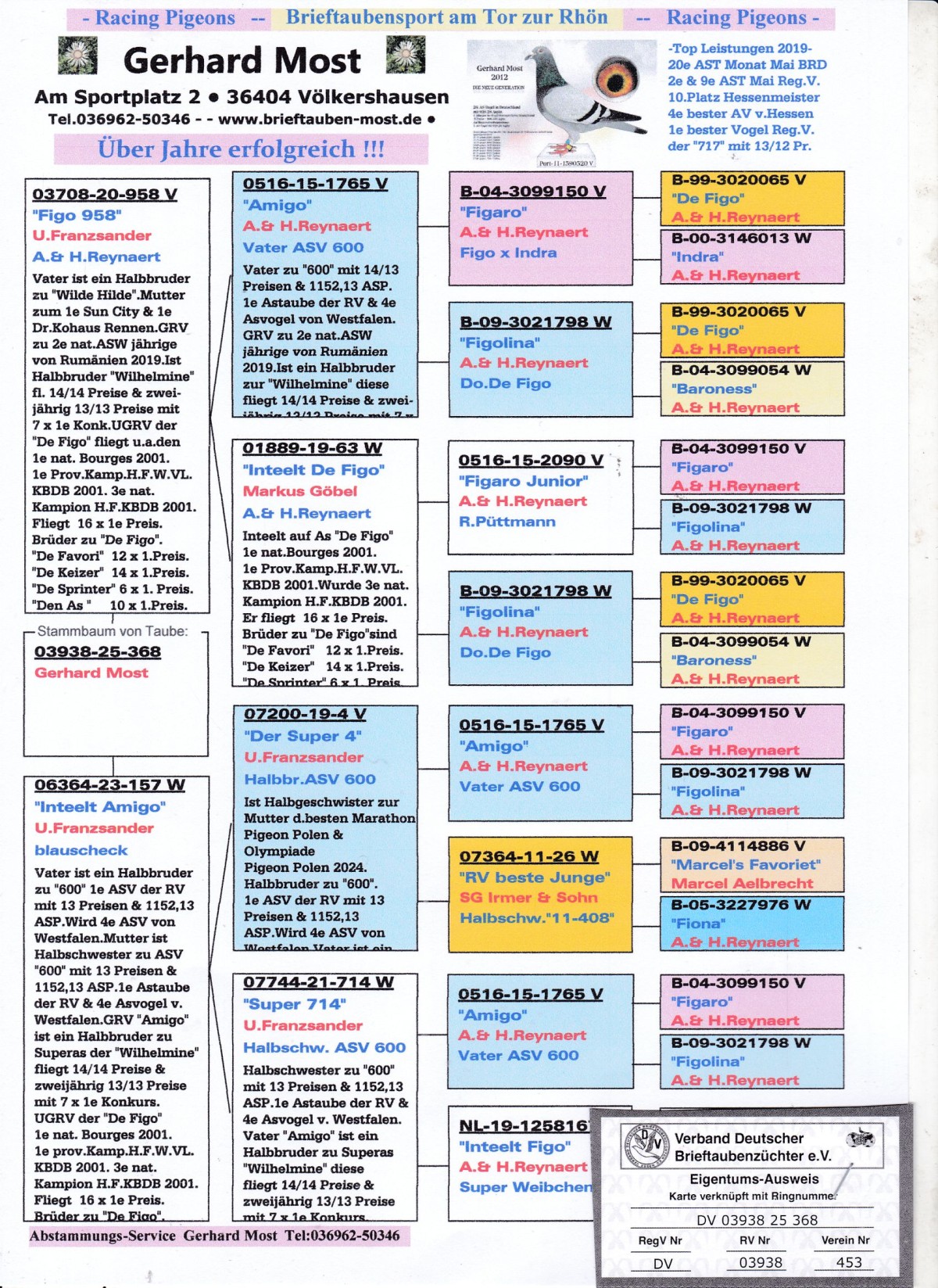oryg. Gerhard Most (100% Reynaert), linia "Amigo", "De Figo" Szczegóły pochodzenia w rodowodzie. UWAGA!!! - płeć gołębia określona jest prawdopodobnie. Gołąb jest sprzedawany bezpośrednio od hodowcy i znajduje się już w Polsce, można go obejrzeć w miejscowości Zblewo (woj. pomorskie), po wcześniejszym kontakcie telefonicznym. Sprzedający może zorganizować transport gołębia w cenie ok. 150 - 200 PLN w zależności od ilości gołębi lub można go odebrać osobiście. Więcej informacji o gołębiu i transporcie pod nr tel.: 511 607 710.