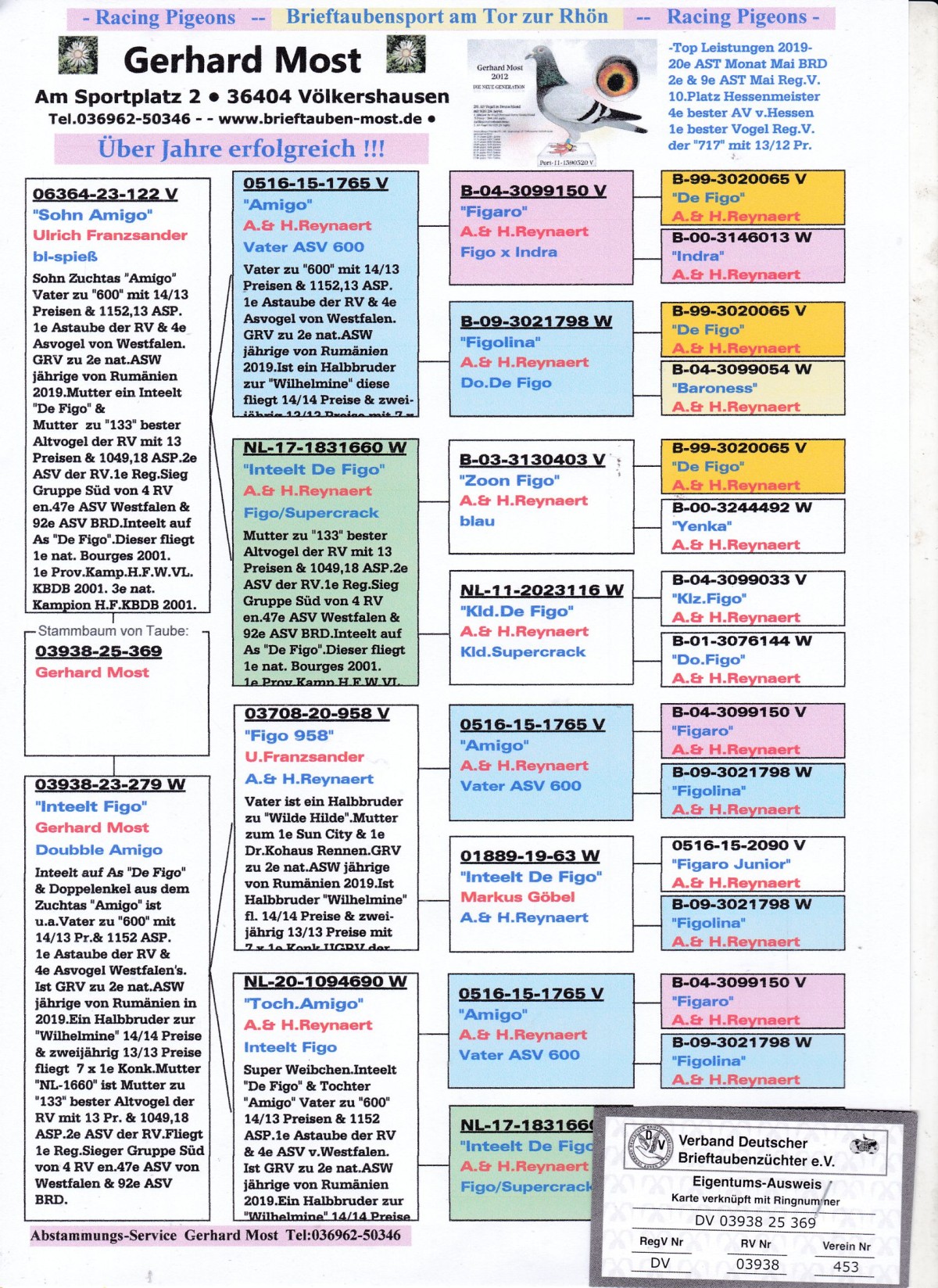 oryg. Gerhard Most (100% Reynaert), linia "Amigo", "De Figo" Szczegóły pochodzenia w rodowodzie. UWAGA!!! - płeć gołębia określona jest prawdopodobnie. Gołąb jest sprzedawany bezpośrednio od hodowcy i znajduje się już w Polsce, można go obejrzeć w miejscowości Zblewo (woj. pomorskie), po wcześniejszym kontakcie telefonicznym. Sprzedający może zorganizować transport gołębia w cenie ok. 150 - 200 PLN w zależności od ilości gołębi lub można go odebrać osobiście. Więcej informacji o gołębiu i transporcie pod nr tel.: 511 607 710.