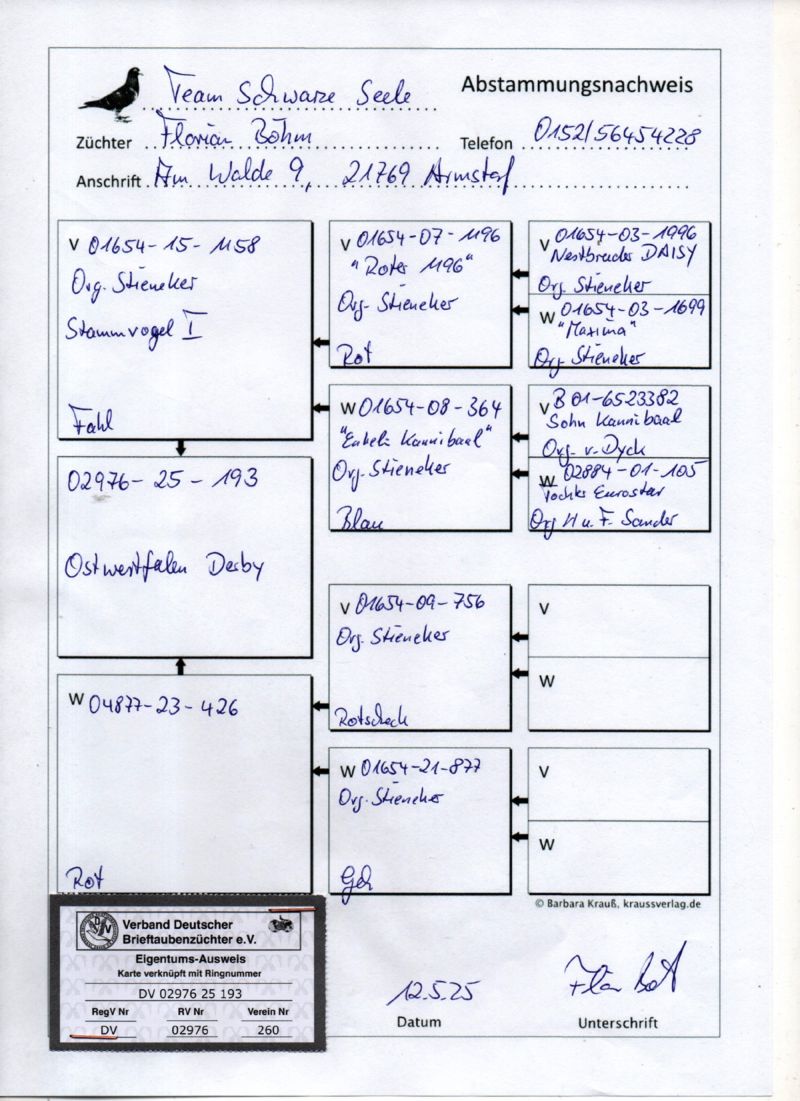 Płeć: młody gołąb Hodowca - rasa: WG Ostwestfalen Derby 2025 Zakończenie: 16.11.2025 godz. 18:56