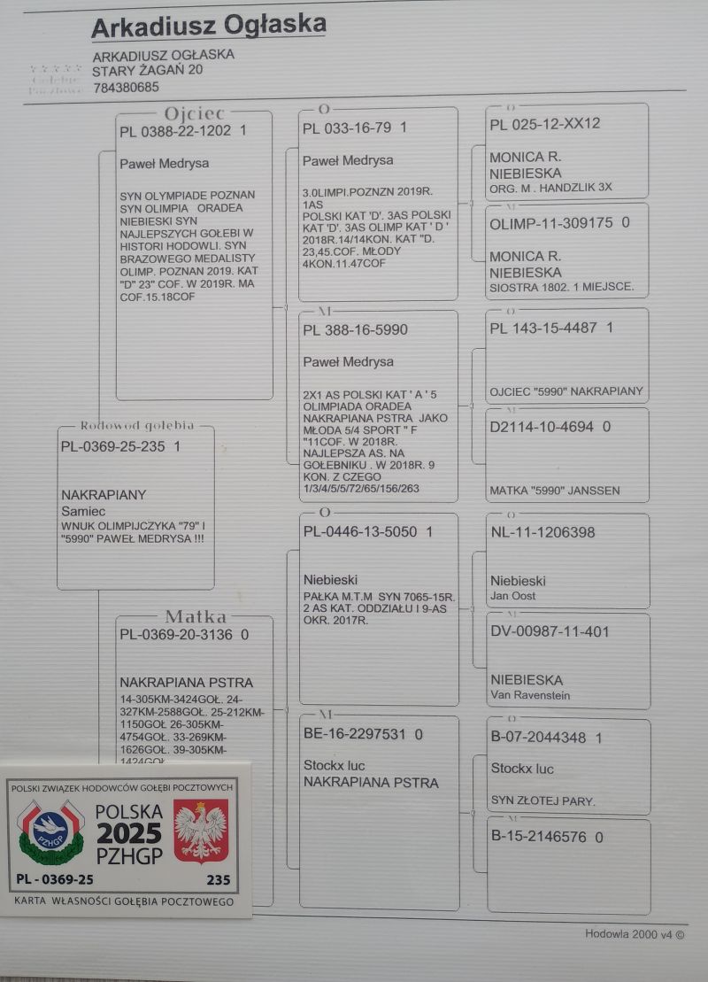 PL-0369-25-235 SYN OLIMPIJCZYKA 79 PAWEŁ MEDRYSA X SAMICA LOTOWA A.OGŁASKA CERTYFIKAT DNA!!!