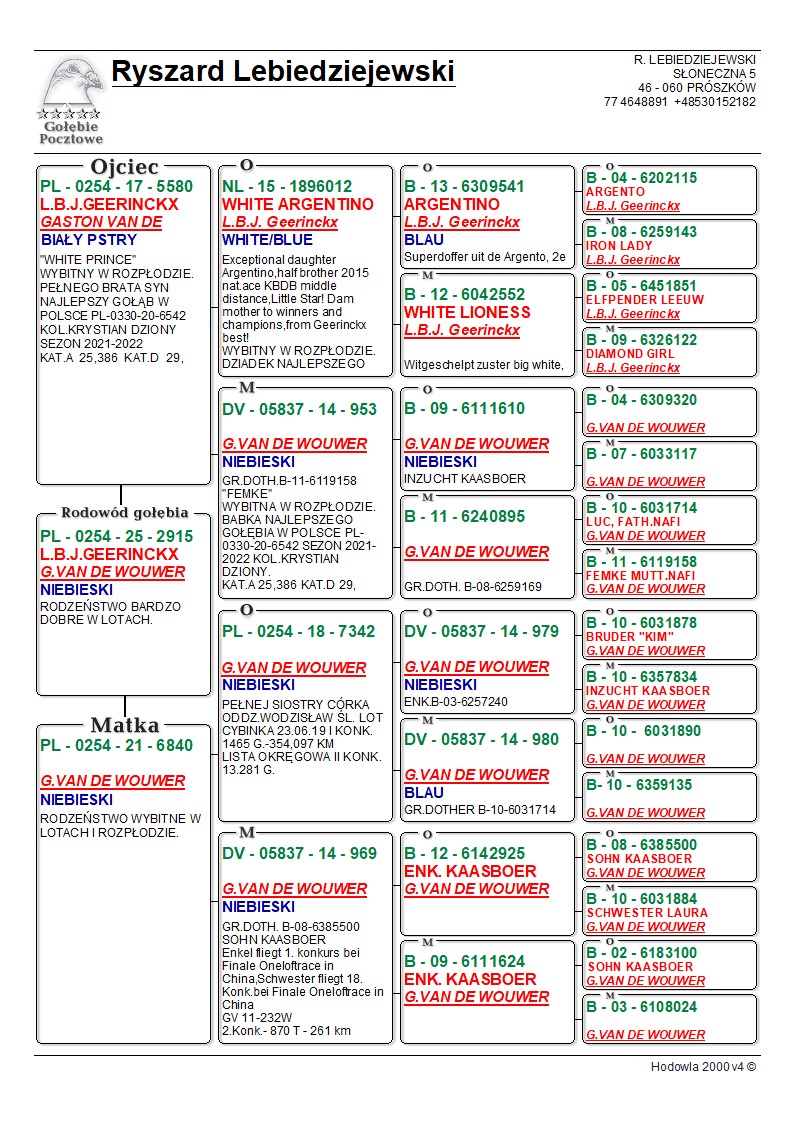 *prawdopodobnie samica** Oryginalny gołąb z hodowli Ryszard Lebiedziejewskiego. Szczegóły pochodzenia w rodowodzie. Więcej informacji pod nr tel.: 530 152 182. **Gołębie po kuracjach przygotowane do sezonu. **Transport gołębi prywatnym kurierem 100 zł do 3 szt. od 4szt do 6szt 150zł.