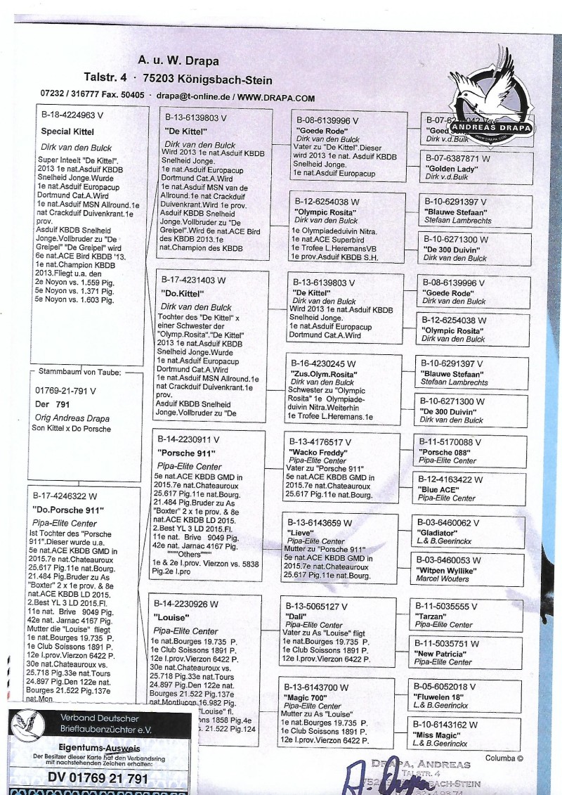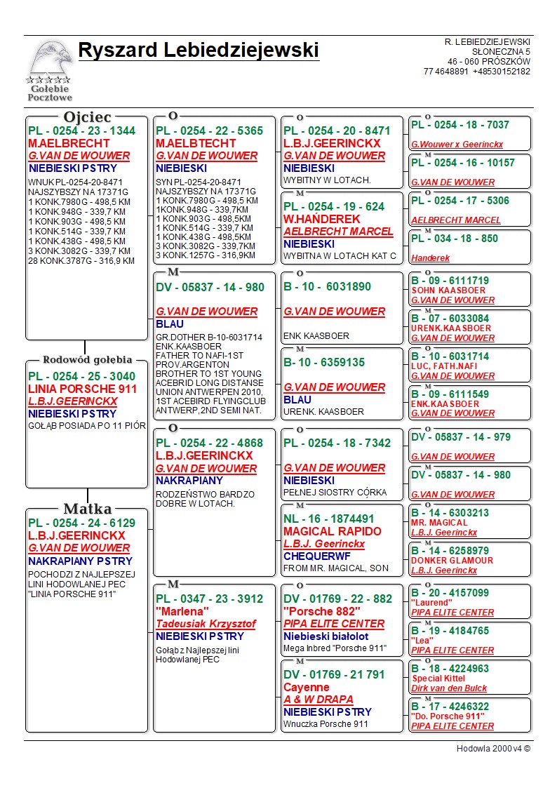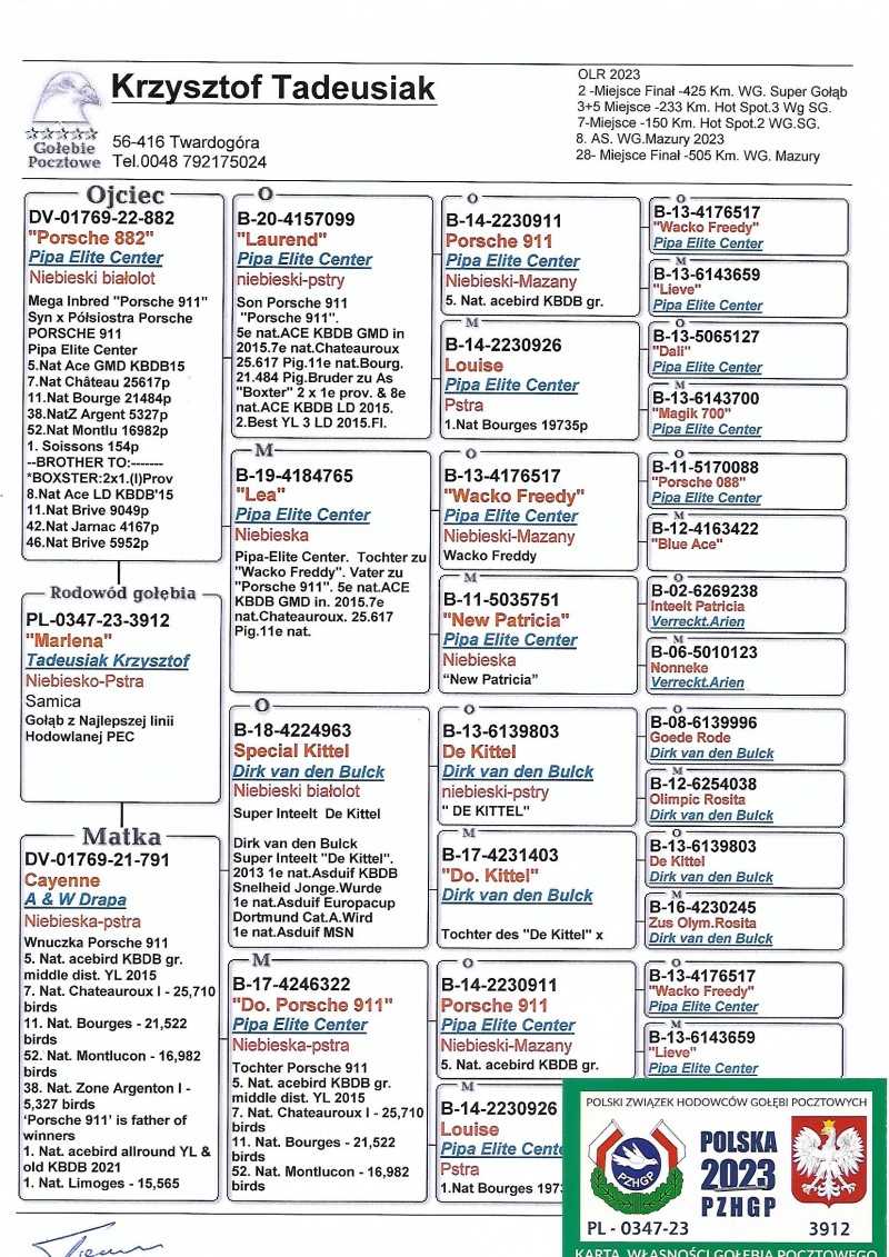 *prawdopodobnie samiec** Oryginalny gołąb z hodowli Ryszard Lebiedziejewskiego. Szczegóły pochodzenia w rodowodzie. Więcej informacji pod nr tel.: 530 152 182. **Gołębie po kuracjach przygotowane do sezonu. **Transport gołębi prywatnym kurierem 100 zł do 3 szt. od 4szt do 6szt 150zł.