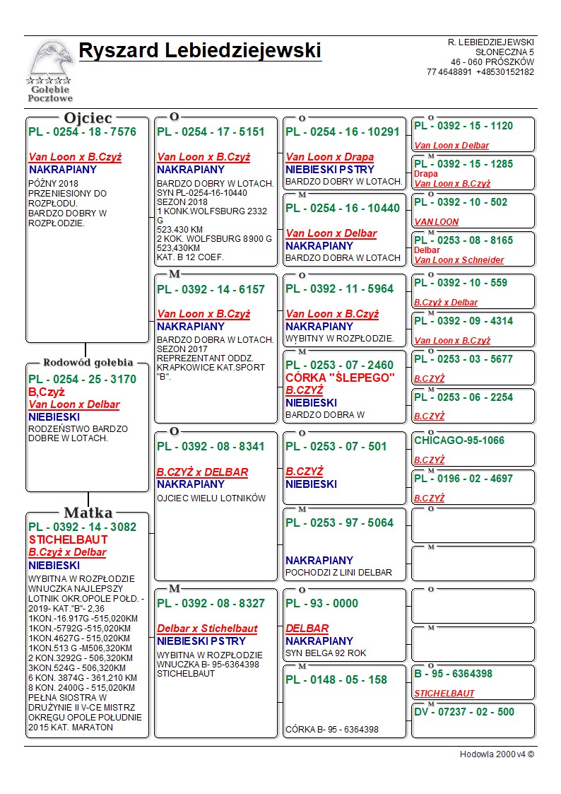 *prawdopodobnie samiec** Oryginalny gołąb z hodowli Ryszard Lebiedziejewskiego. Szczegóły pochodzenia w rodowodzie. Więcej informacji pod nr tel.: 530 152 182. **Gołębie po kuracjach przygotowane do sezonu. **Transport gołębi prywatnym kurierem 100 zł do 3 szt. od 4szt do 6szt 150zł.