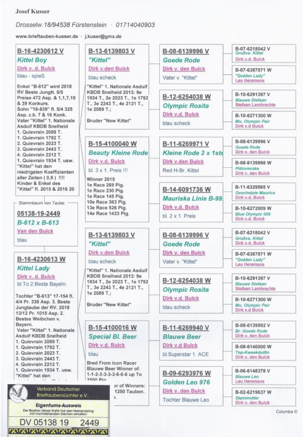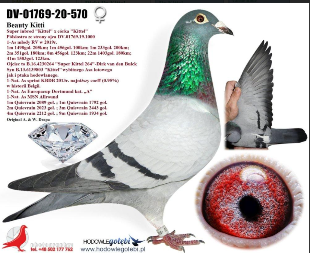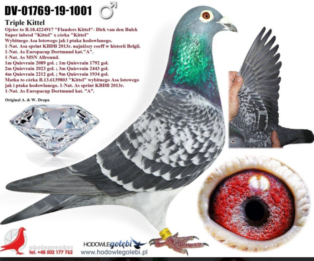 Ojciec mlodego pochodzi z 100% Dirk van den Bulck (prawnuk De Kittel) Matka mlodego pochodzi z 100% Dirk van den Bulck (wnuczka De Kittel) Golab nie jest zaszczepiony. Wychowany w boksie indywidualnym z mozliwoscia zbadania pokrewienstwa. Szczegoly pochodzenia w rodowodzie. Wiecej informacji pod nr: +48577604897