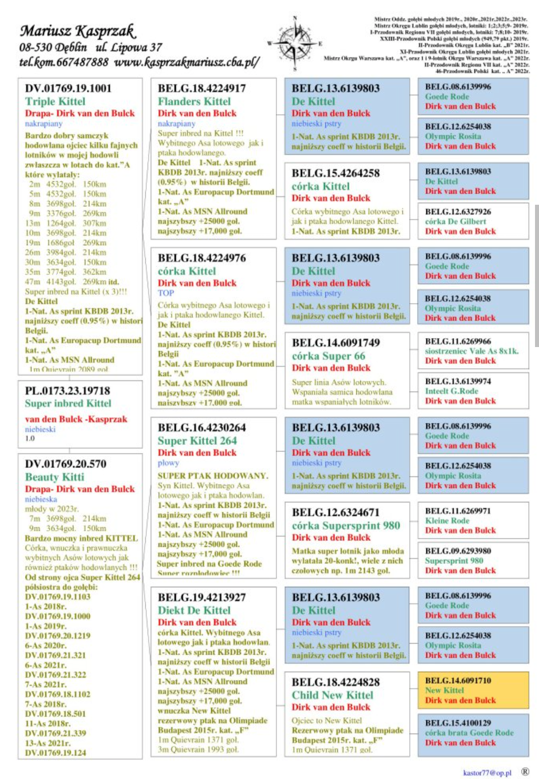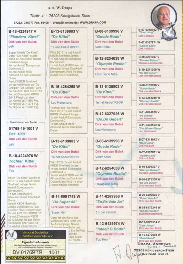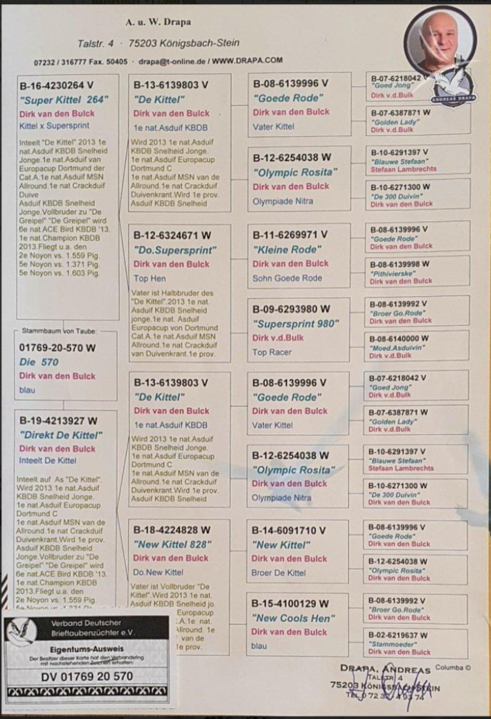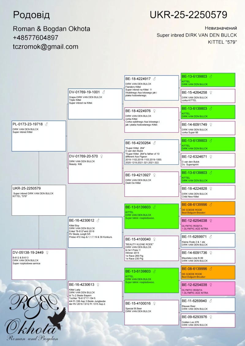 Ojciec mlodego pochodzi z 100% Dirk van den Bulck (prawnuk De Kittel) Matka mlodego pochodzi z 100% Dirk van den Bulck (wnuczka De Kittel) Golab nie jest zaszczepiony. Wychowany w boksie indywidualnym z mozliwoscia zbadania pokrewienstwa. Szczegoly pochodzenia w rodowodzie. Wiecej informacji pod nr: +48577604897