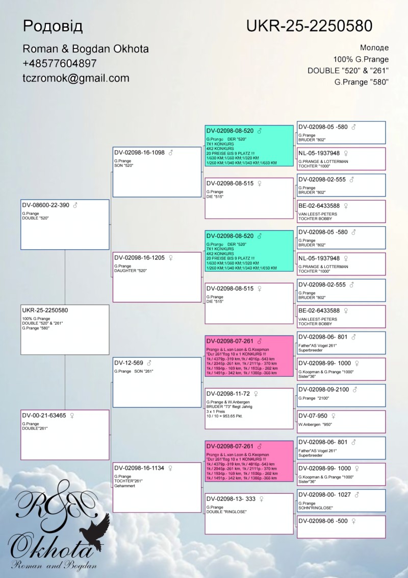 Oryginalny golab z pochodzenia G.Prange. Ojciec mlodego pochodzi z 100% G.Prange,wnuk (DER "520") .Matka mlodego pochodzi z 100% G.Prange,wnuczka (DER"261"). Golab nie jest zaszczepiony. Wychowany w boksie indywidualnym z mozliwoscia zbadania pokrewienstwa. Szczegoly pochodzenia w rodowodzie. Wiencej informacji pod nr: +48577604897