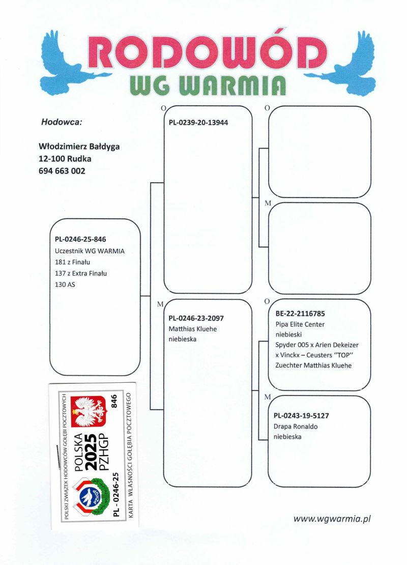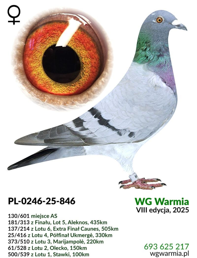 Uczestnik WG Warmia 2025, sezon VIII. Loty z kierunku północny wschód, Litwa. 181 z Finału, 130 AS, 137 z Extra Finału. Szczegóły pochodzenia w rodowodzie.