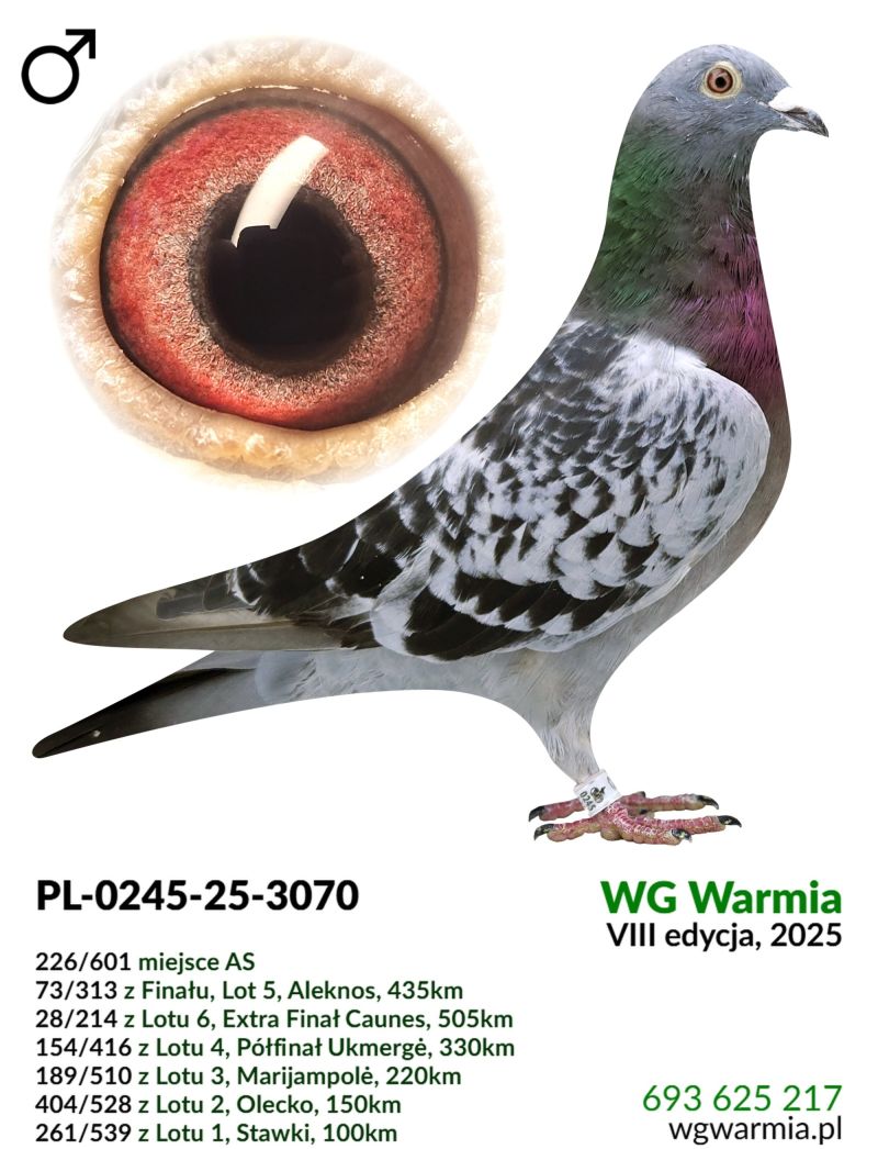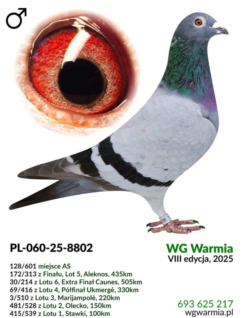 Uczestnik WG Warmia 2025, sezon VIII. Loty z kierunku północny wschód, Litwa. 172 z Finału, 128 AS, 30 z Extra Finału. Szczegóły pochodzenia w rodowodzie.
