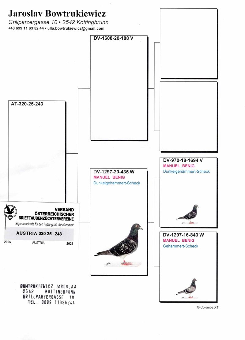 Uczestnik WG Warmia 2025, sezon VIII. Loty z kierunku północny wschód, Litwa. 164 z Finału, 82 AS, 33 z Extra Finału. Szczegóły pochodzenia w rodowodzie.