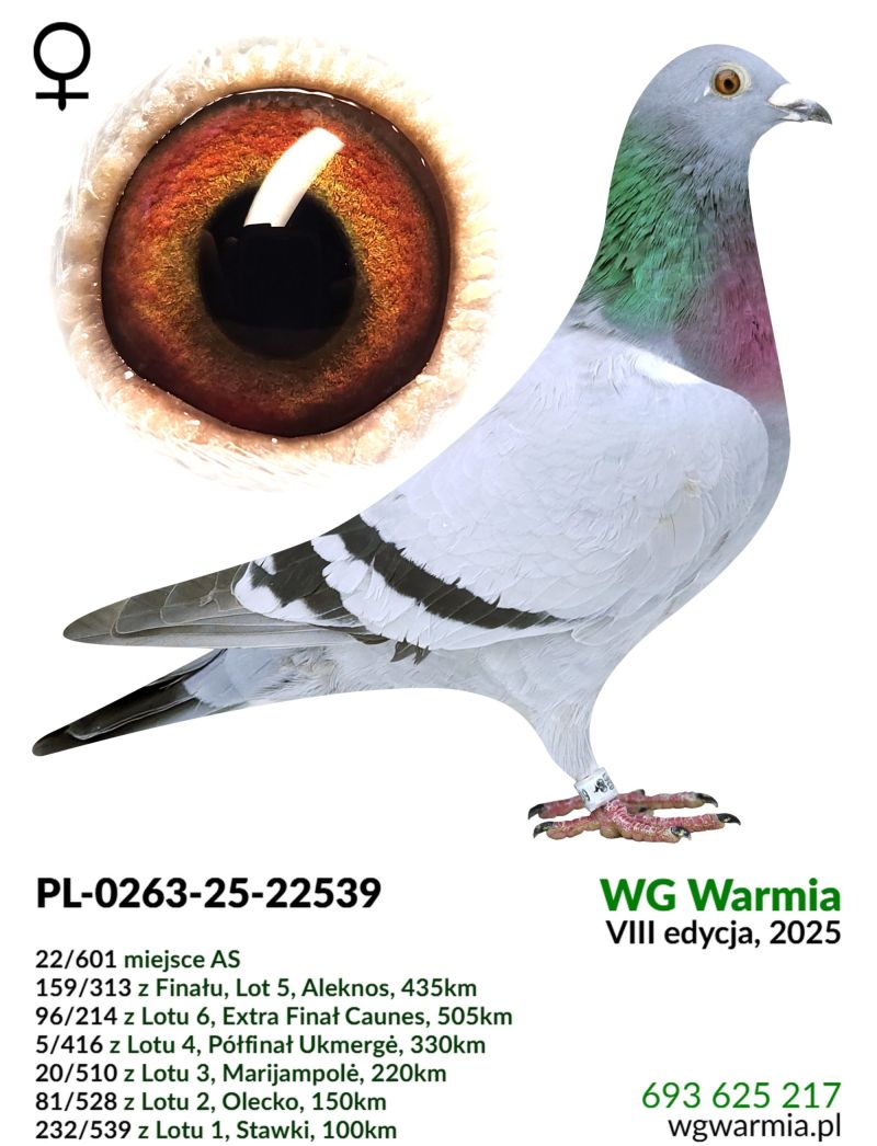 Uczestnik WG Warmia 2025, sezon VIII. Loty z kierunku północny wschód, Litwa. 159 z Finału, 22 AS, 96 z Extra Finału. Szczegóły pochodzenia w rodowodzie.