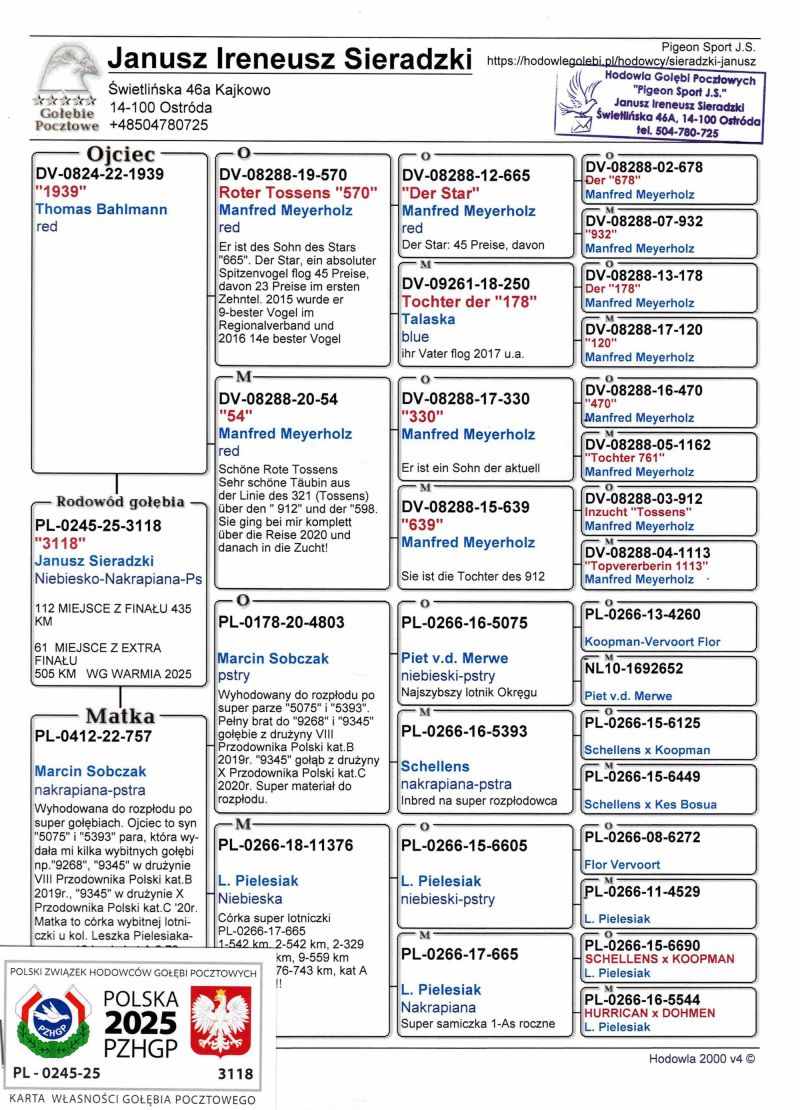 Uczestnik WG Warmia 2025, sezon VIII. Loty z kierunku północny wschód, Litwa. 112 z Finału, 32 AS, 61 z Extra Finału. Szczegóły pochodzenia w rodowodzie.