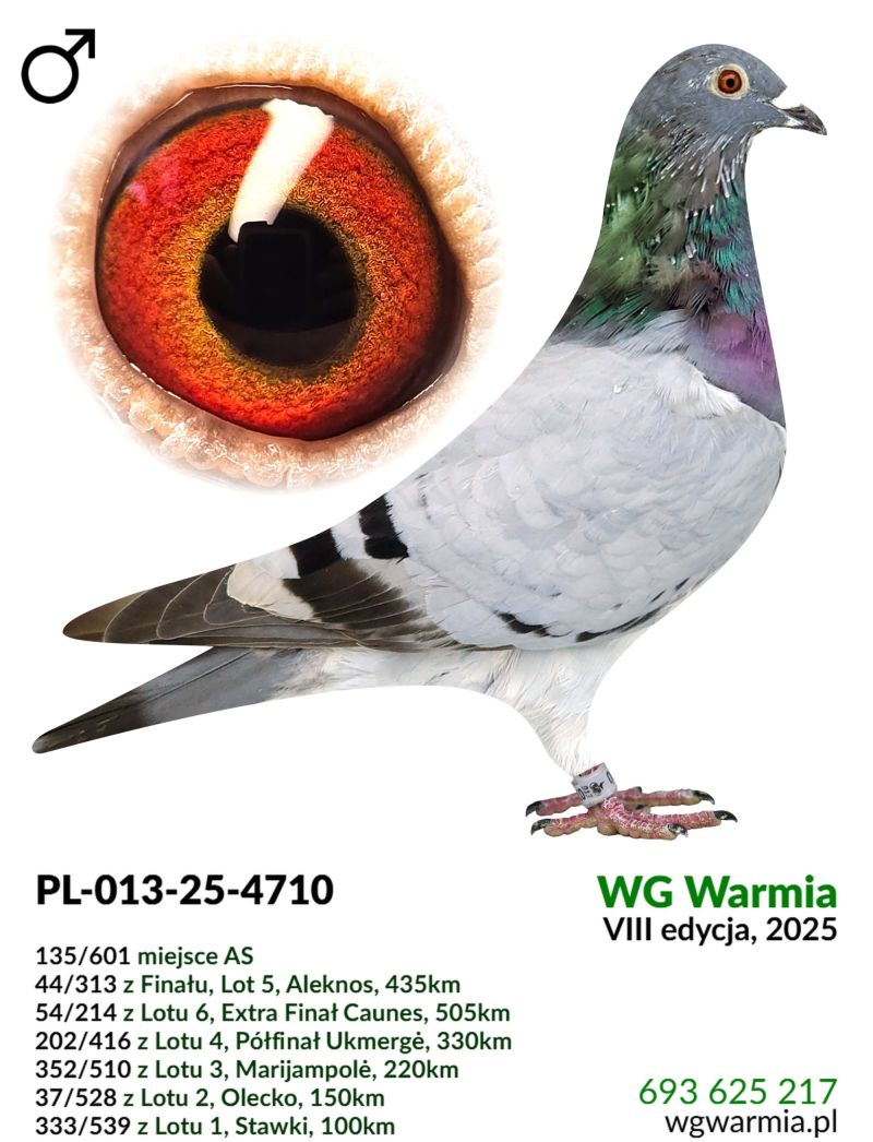 Uczestnik WG Warmia 2025, sezon VIII. Loty z kierunku północny wschód, Litwa. 44 z Finału, 135 AS, 54 z Extra Finału. Szczegóły pochodzenia w rodowodzie.