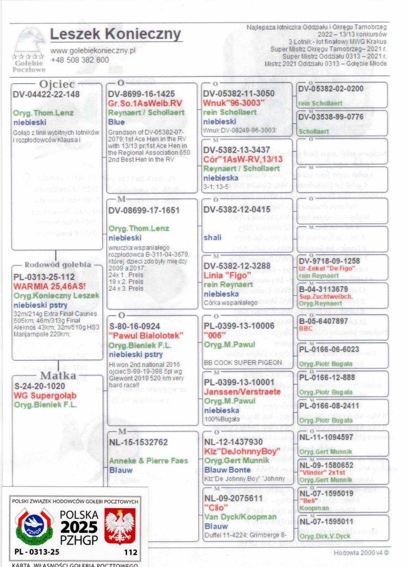 Uczestnik WG Warmia 2025, sezon VIII. Loty z kierunku północny wschód, Litwa. 12 z Finału, 46 AS, 32 z Extra Finału. Szczegóły pochodzenia w rodowodzie.