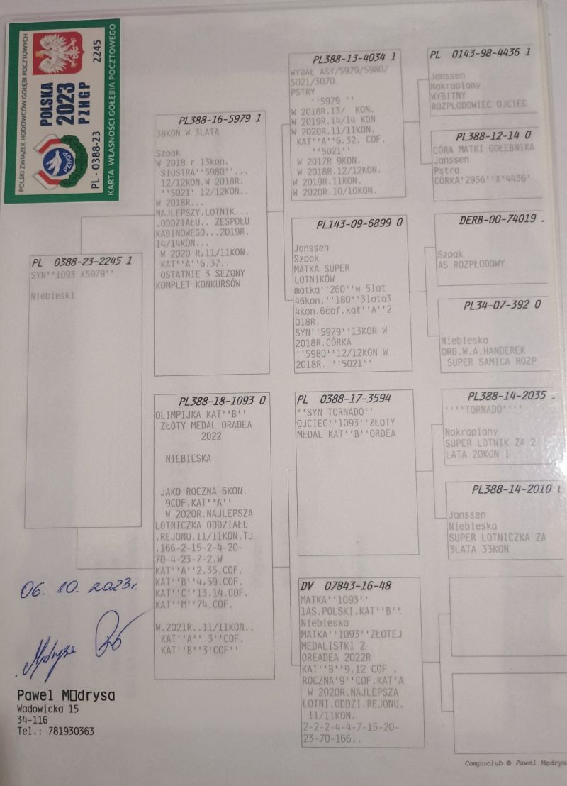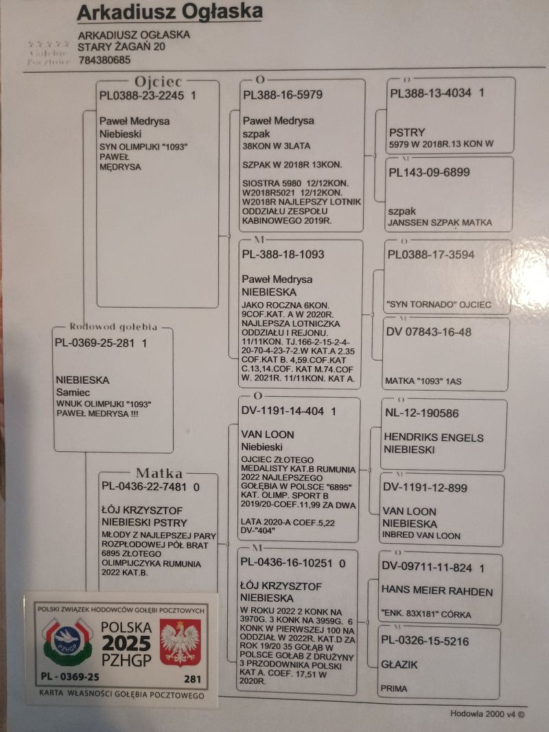 PL-0369-25-235 SYN OLIMPIJCZYKA 79 PAWEŁ MEDRYSA X SAMICA LOTOWA A.OGŁASKA CERTYFIKAT DNA!!!