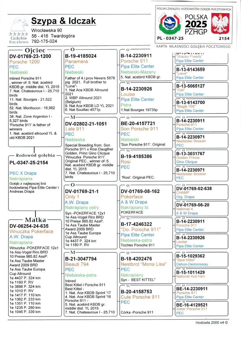 Profesjonalna hodowla z wieloletnim doświadczeniem, posiadająca w swoim stadzie materiał najwyższej światowej klasy. Więcej informacji w załączonych materiałach oraz pod nr tel. 792-175-024 Oferowany gołąb to prawdopodobnie SAMICA. Płeć pisana orientacyjnie Wysyłka 100 zł