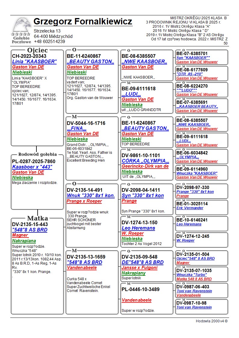 Gołębie z tej linii od wielu lat przyczyniały się do zdobycia takich sukcesów jak :