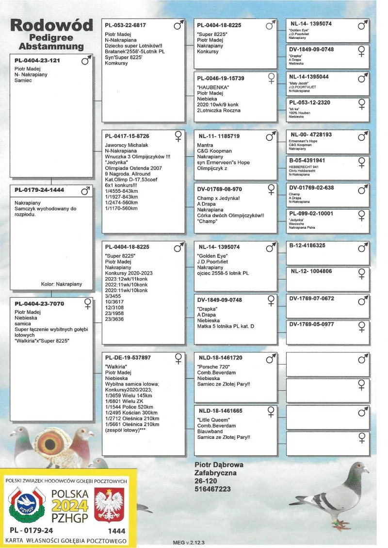Oryginalny gołąb z hodowli Piotr Dąbrowa Wyhodowany po oryginałach Piotra Madeja. Szczegóły pochodzenia w rodowodzie. Więcej informacji pod nr tel.: 516467223 **wysyłka od 100 do 180 zł
