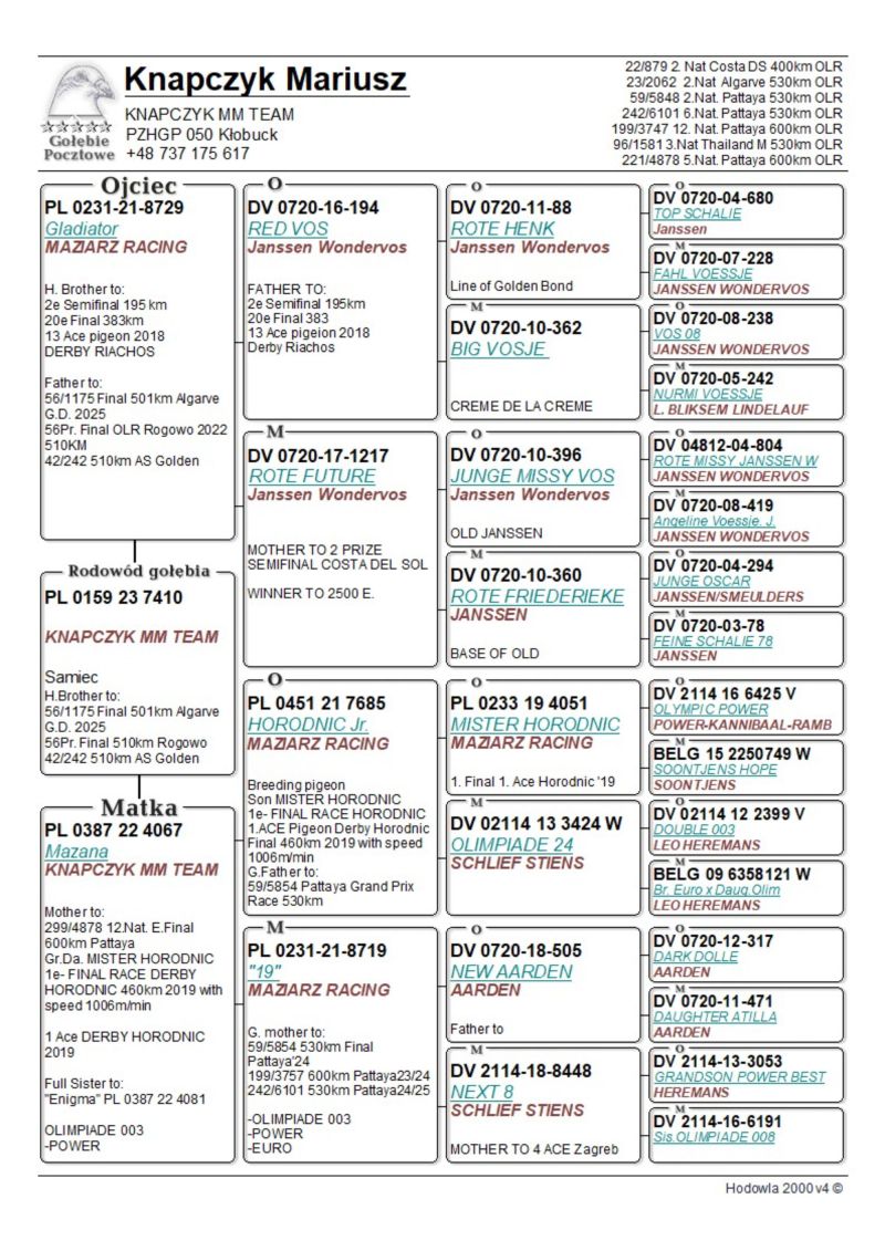 Samczyk z "Gladiator Vos", którego ojcem jest najlepszy z rodziny Vos rozpłodowiec "Red Vos 197" od Maziarz R.T. Matka to pełna siostra "Enigmy" podstawowej samicy rozpłodowej. Juz w pierwszym roku wydała 9 z Polski na extra finale 600km!! Nasze gołębie rywalizują z potentatami gołębiarskimi z całego świata. Więcej szczegółowych informacji na tel.