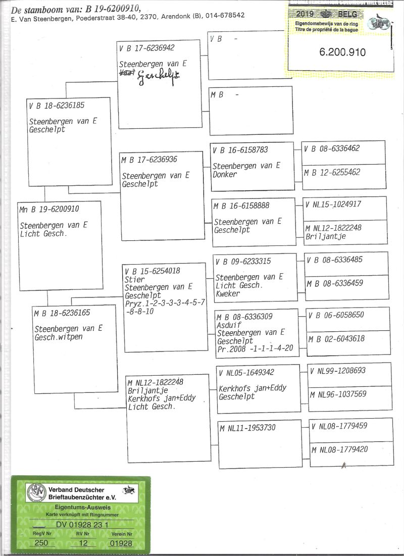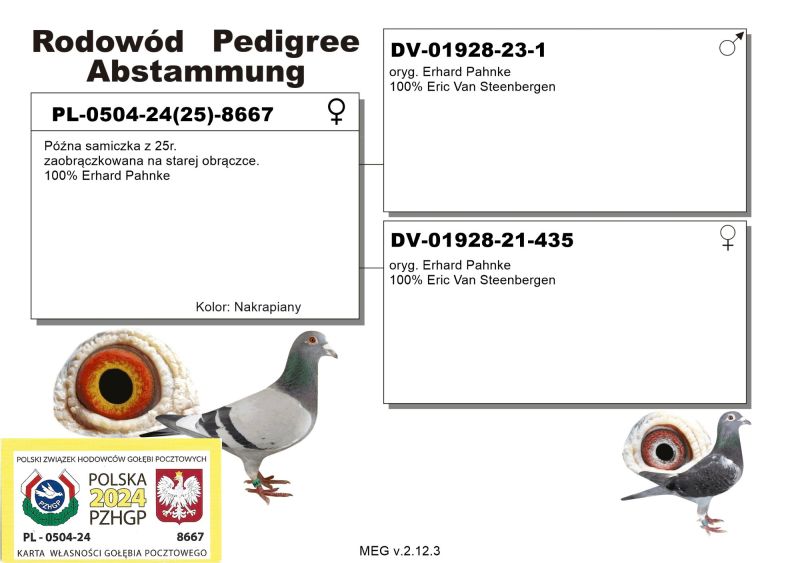 Oryginalny gołąb z hodowli Bartłomiej Gapys (100% Erhard Pahnke). Szczegóły pochodzenia w rodowodzie.